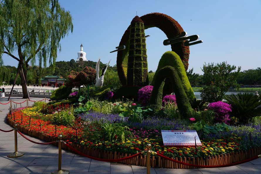 在北海公园,一组以延安宝塔为主景的花坛已在南门广场亮相。花坛名为“继往开来”,在一轮红日的光辉映衬下,与水面白塔红墙美景相互融合。近景处布置立体荷花、仙鹤造型,采用荷花、凤仙等应季花卉。展现祖国风华正茂、人民生活富足,如旭日东升般蒸蒸日上,一派喜庆祥和的气氛。