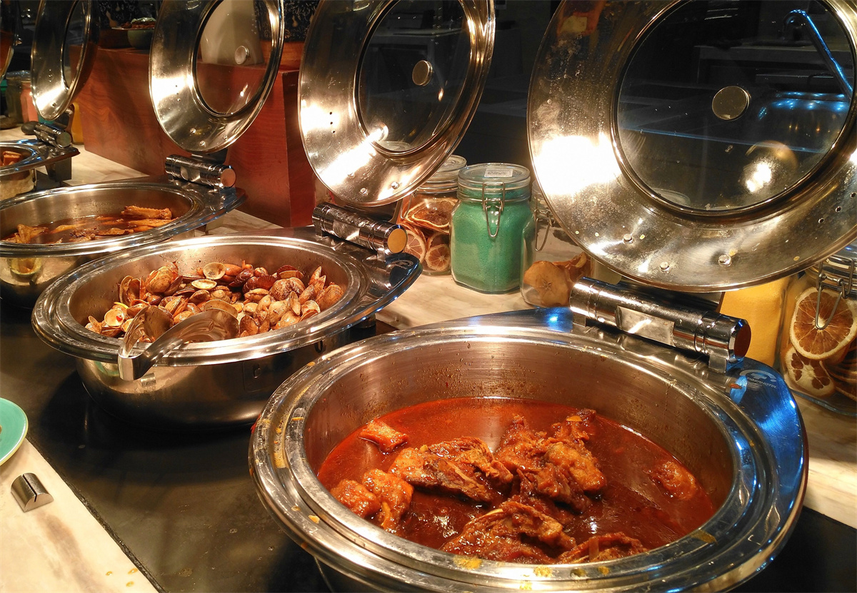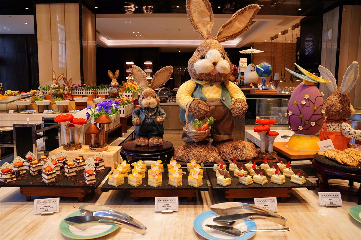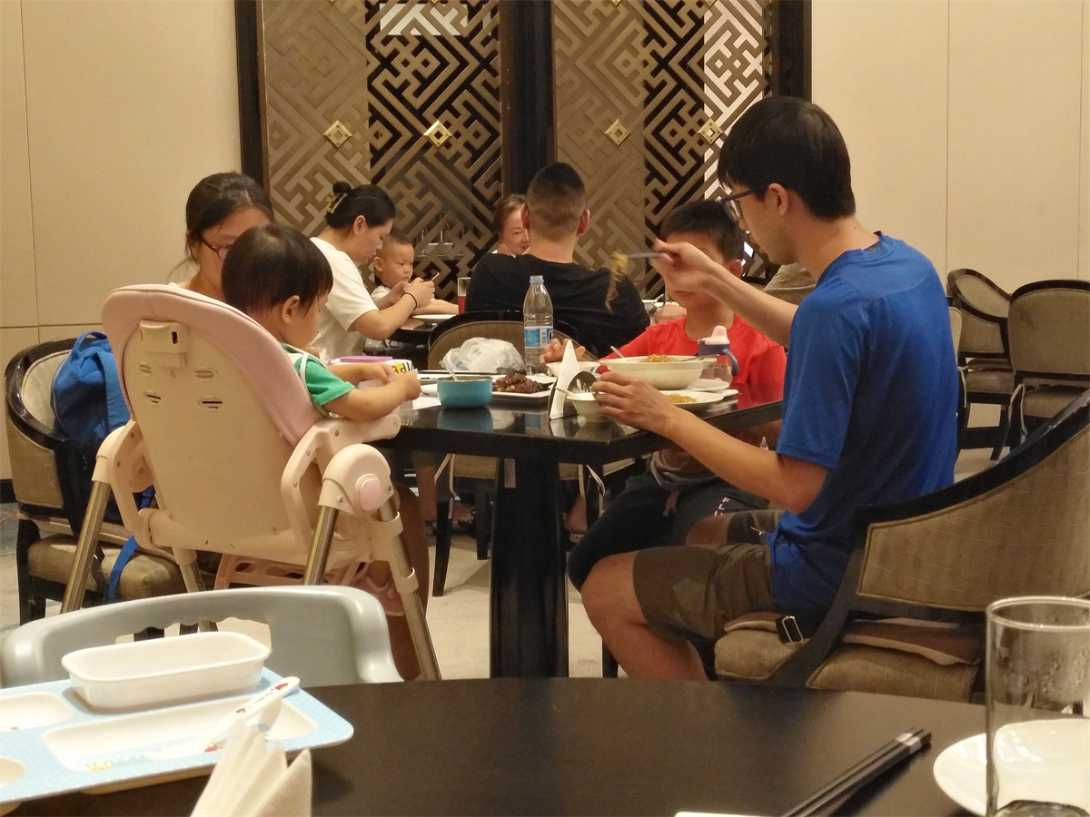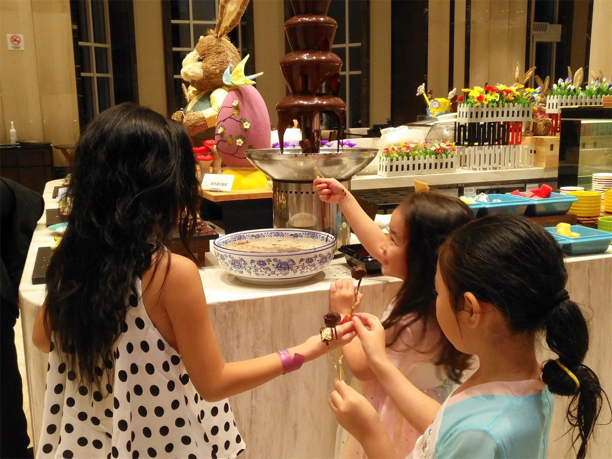 自助餐厅为亲子家庭提供了选择余地较大的西餐甜品、蔬菜水果、中式饭菜以及地方特色的汤面等,可谓琳琅满目。孩子们穿行在有着小动物、机器人装饰物的餐桌前,自由自在地选择自己最喜爱的美食。特别是花样翻新的蛋糕、蛋挞更成为小朋友们的最爱,巧克力瀑布前,总有孩子亲手制作水果巧克力棒忙碌的身影。通常情况下住宿酒店的客人,自助早餐是免费供应的,在这里就餐,感觉早餐比晚餐更丰富。