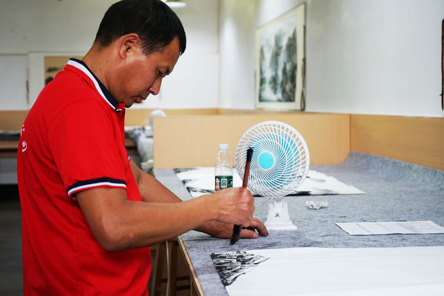 新河画村主要以知墨国画室为典型代表,该画室系返乡创业本地老板开设,目前拥有员工约30人,其作品主要销往桂林国画集散中心。画室也是采取统一培训、统一订单、统一销售的运营模式,农民画师经3个月左右培训即可上岗,分工负责画山水,画人物及上色等不同工序,主要进行,画师计件收入,按作品尺寸计价,画师每月可以获得3000元—7000元不等的收入,该画室曾被认定为“浏阳市就业扶贫车间”,吸收了19名贫困户就业增收。“去年这的农民创作的10米国画还搬上了中央媒体舞台。”相关负责人介绍说。