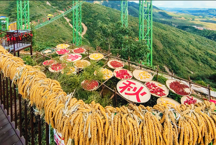 在第72个国庆节来临之际,车神架风景区举行了一系列丰富多彩的活动内容,其中正在进行的“天空之眼晒秋季”让所有观光的游客惊喜不已,满地金的南瓜、玉米,火红的辣椒、山楂果,橙黄的黍子、花生等等,将景区装扮得五彩缤纷,游客们纷纷打卡拍照发布朋友圈等网络社交平台。