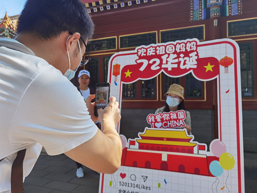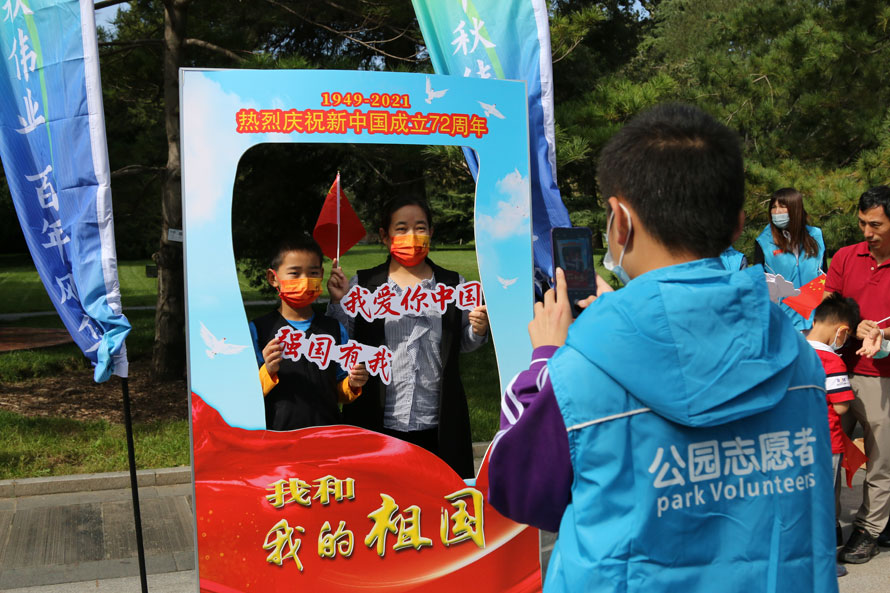 各公园营造国庆喜庆氛围,为游客发放国旗,张贴特色贴纸,邀请游客与主题展板合影。颐和园在爱国主义教育基地耕织图水操学堂向游客发放水操学堂宣传折页和“我爱祖国”贴纸,在益寿堂组织游客与国旗合影,发放红色定制口罩,开展党史互动答题;北京植物园一二九纪念地开展“红色书屋读党史”教育活动,游客手持国旗在爱国主义教育基地合影留念;天坛公园开展“我爱你中国”拍照打卡活动,设置了“最美情书 祝福祖国”留言板,游客踊跃留下自己对祖国的祝福,北海公园为游客发放小国旗,倡导文明游园,向游客讲述北海的故事。
