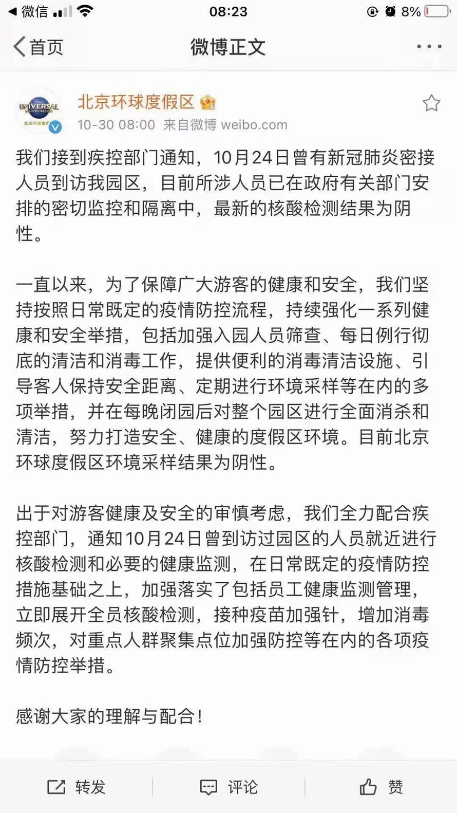 10月30日,北京环球度假区官方微博发布消息称:接到疾控部门通知,10月24日曾有新冠肺炎密接人员到访我园区,目前所涉人员已在政府有关部门安排的密切监控和隔离中,最新的核酸检测结果为阴性。