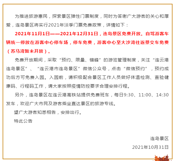 连云港连岛景区日前对外发布通知,自2021年11月1日——2021年12月31日,连岛景区免费开放。