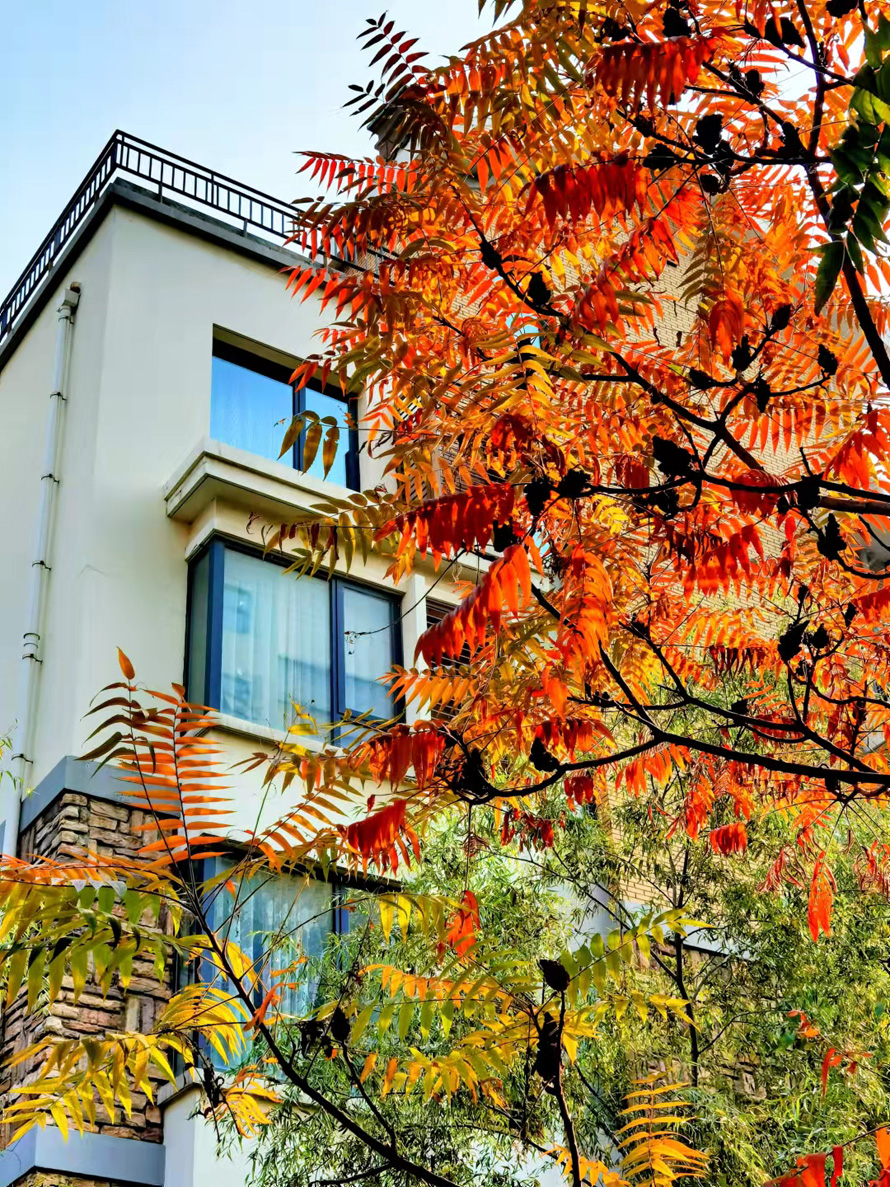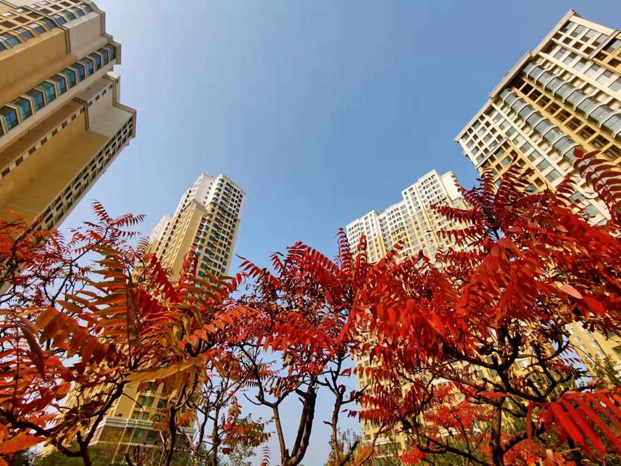 燕郊潮白河畔美林湾小区,红叶楼宇相映,勾勒秋天画卷。