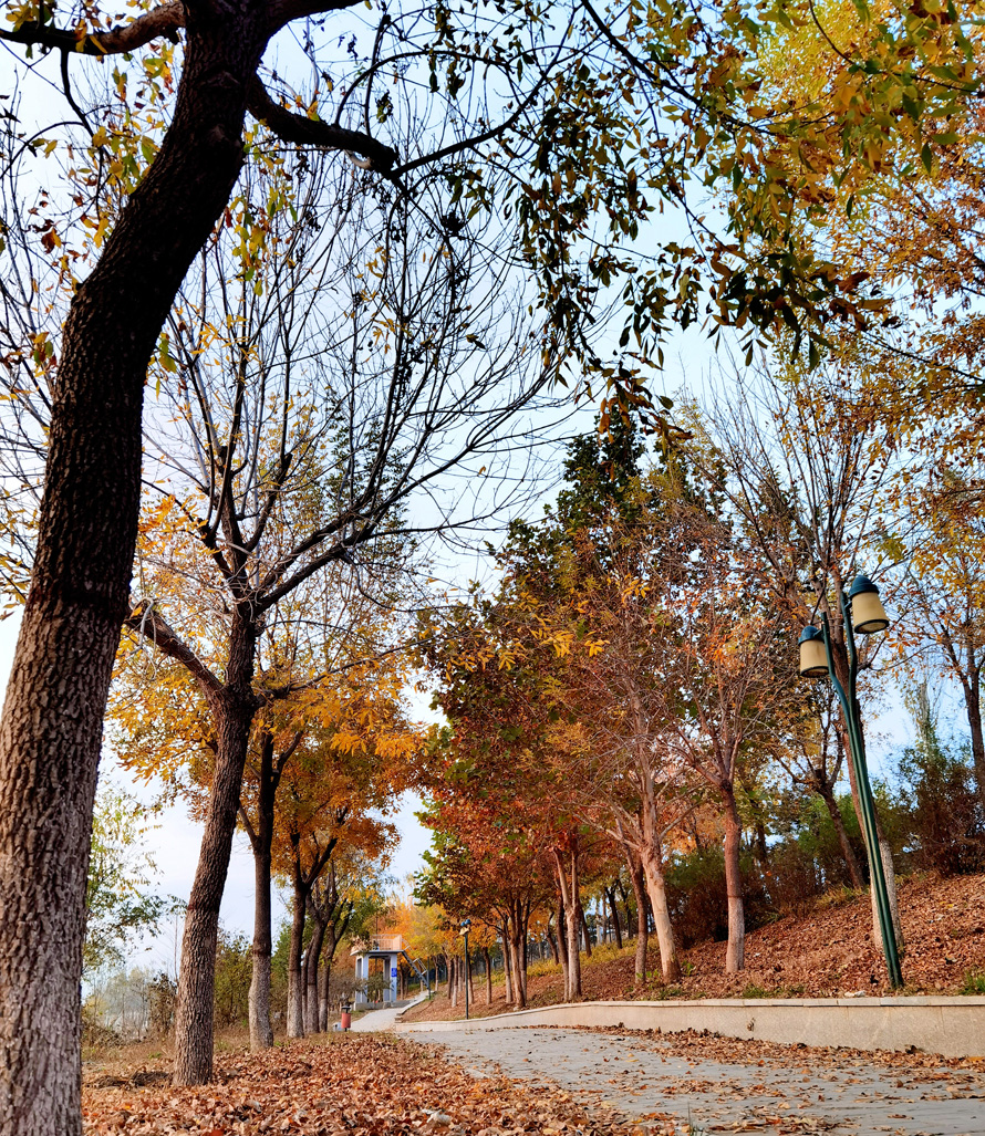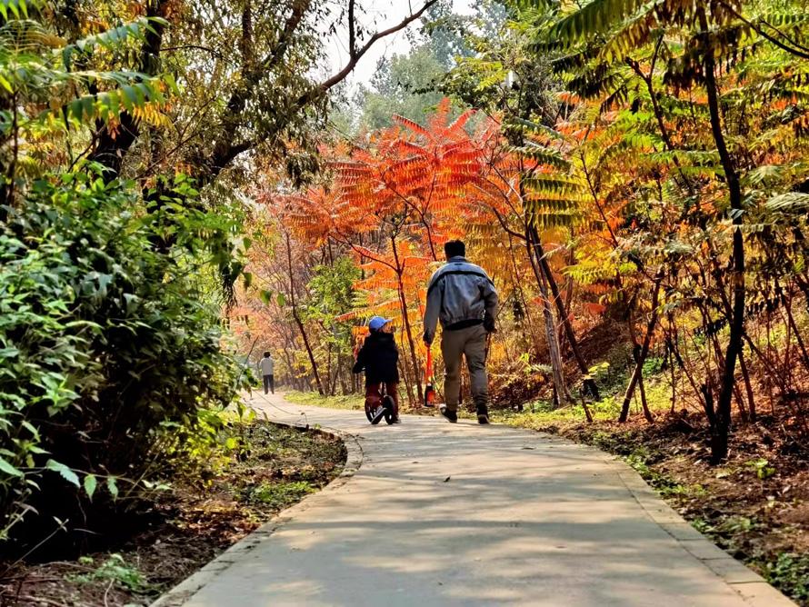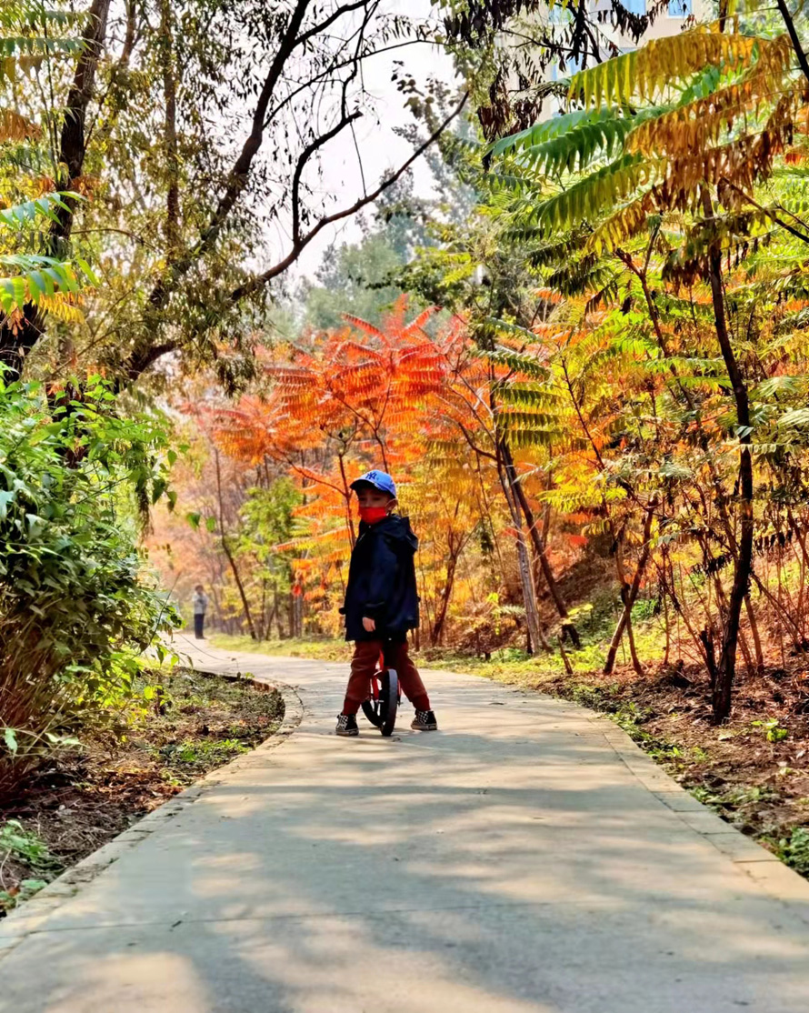 燕郊潮白河畔美林湾小区,一对父子走在秋光里。