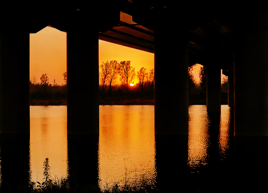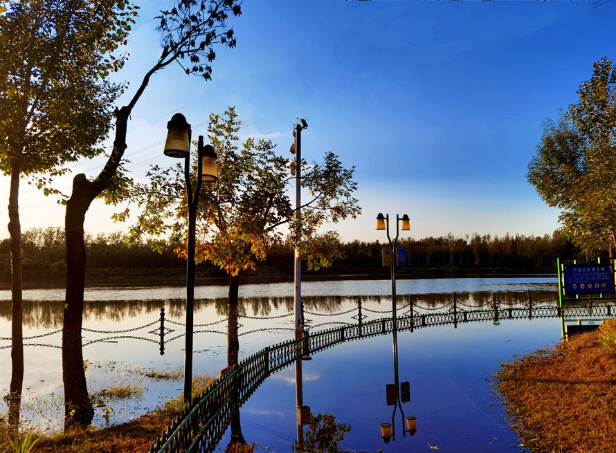 燕郊潮白河水淹没了小路,形成丰富的视觉。