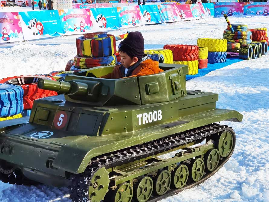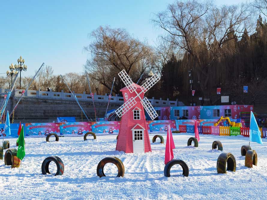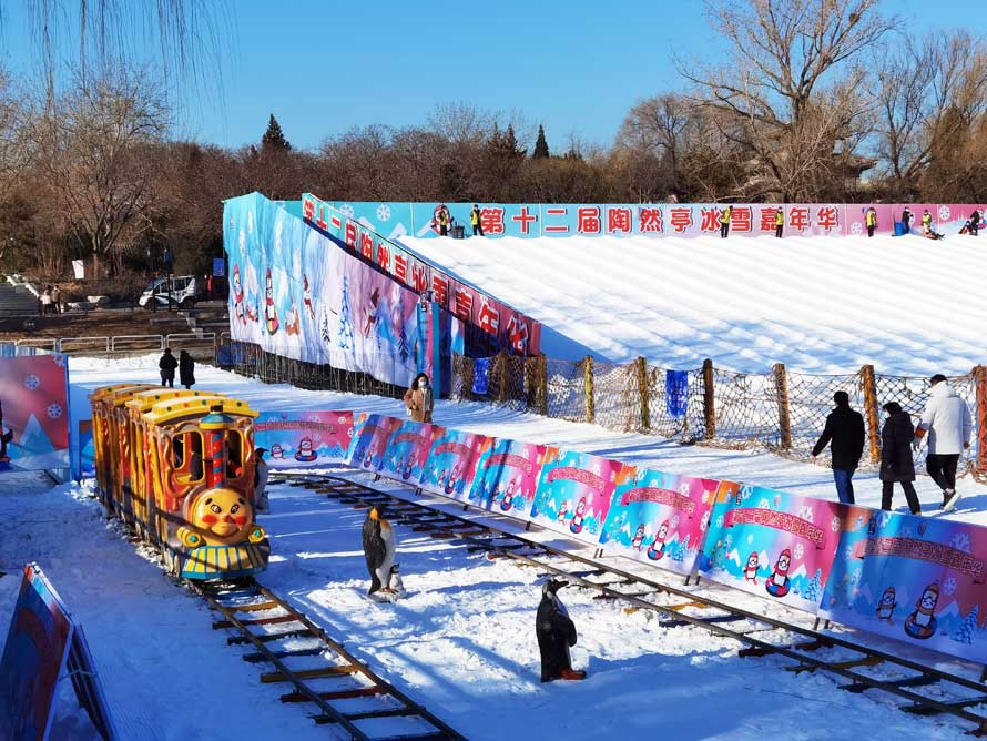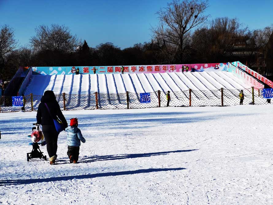 同时,紫竹院公园北小湖1.5万平方米的雪场也面向游客开放。高6米、长80米的雪山滑梯设有16条滑雪道,游客坐在雪圈上可从滑梯顶端呼啸而下,滑行出数十米远,体验雪上飞翔的刺激;同时,还有雪地坦克、摩托车、卡丁车、装甲车、雪国列车、动感悠波、回旋大冒险等8项经典的雪上趣味娱乐项目一一呈现。