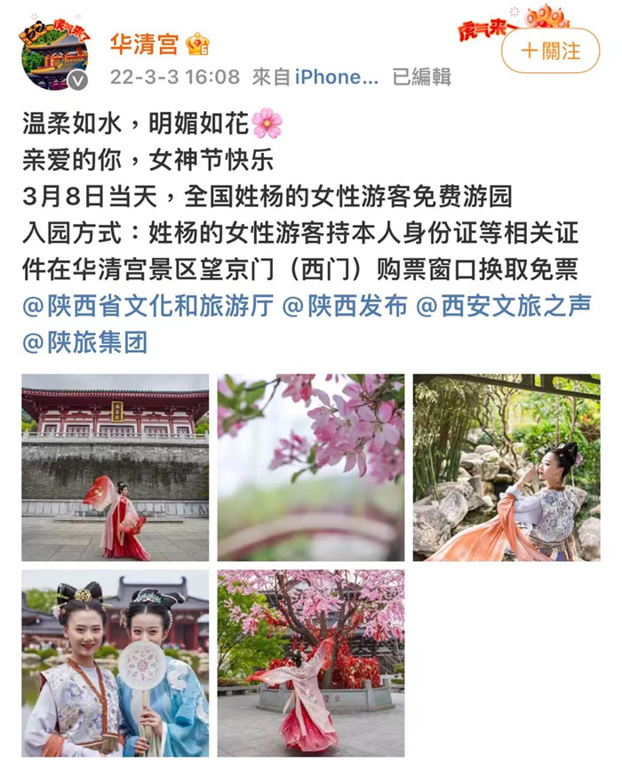 日前,位于陕西省西安市临潼区的华清宫景区发文称,3月8日当天,全国姓杨的女性游客免费游园,姓杨的女性游客可持本人身份证等相关证件在华清宫景区望京门(西门)购票窗口换取免票。