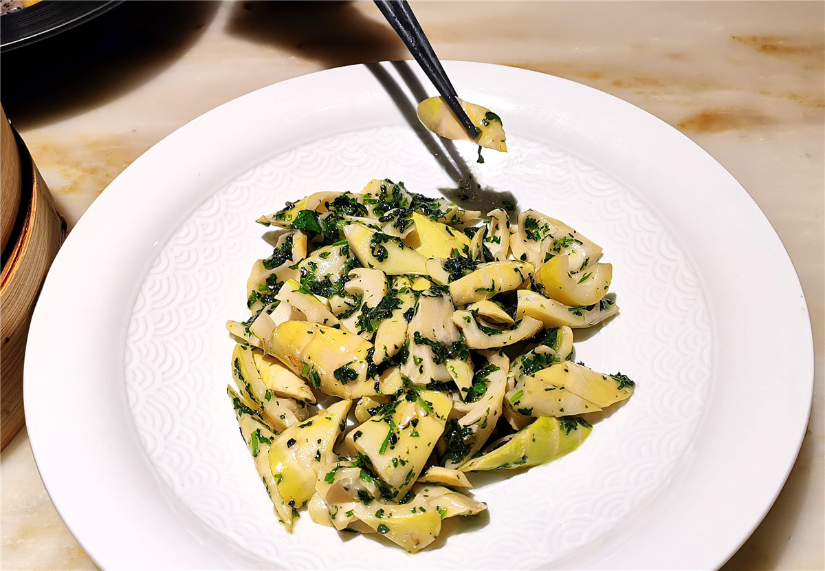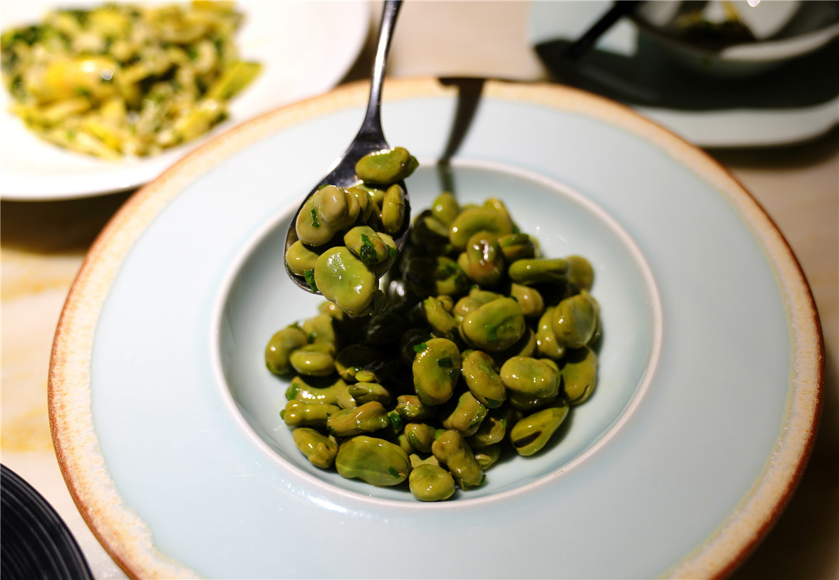 餐桌上“咬春尝鲜”字样的菜单引起我们的注意。热心的服务员告诉我们,淮扬菜讲究不时不食,严格遵循中华民族的民俗传统,所用食材应时令、按季节,到什么时候吃什么东西。循着菜单望去:刀鱼馄饨、荠菜炒春笋、上海白米葱炒嫩蚕豆、手工细沙青团、咸蛋黄肉松青团、梅干菜红烧肉青团,春笋草头河豚鱼汤,主食、热菜、点心、汤水等样样俱全且呈现一派“春意盎然”。