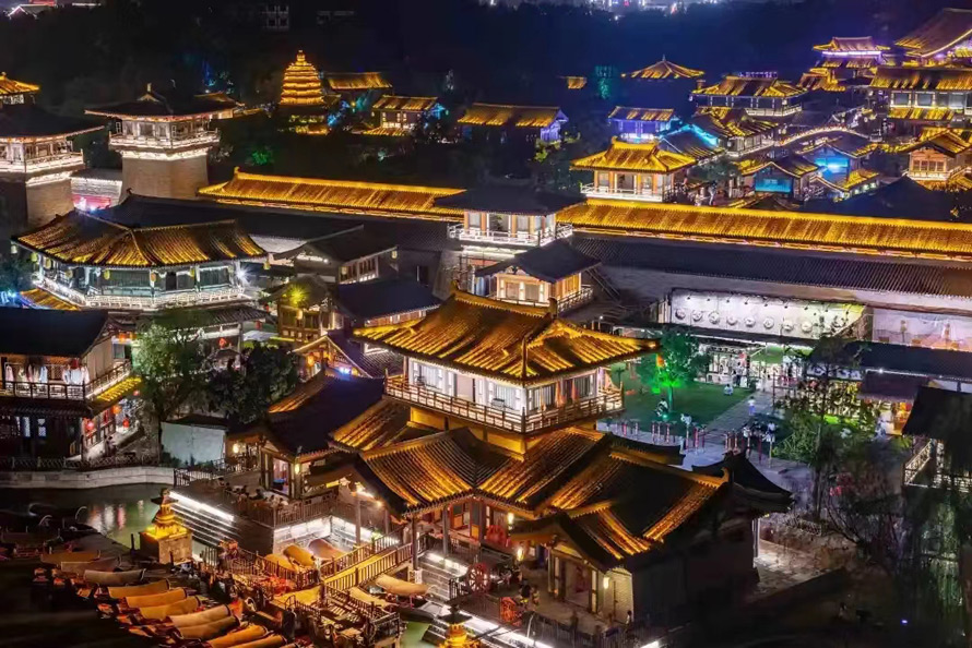 夜幕下,位于湖北襄阳的盛世唐城景区流光溢彩、游人如织。气势恢宏的仿唐建筑群,轮番上演的复古演艺、仙袂飘飘的唐装秀女,好一派盛唐气象。