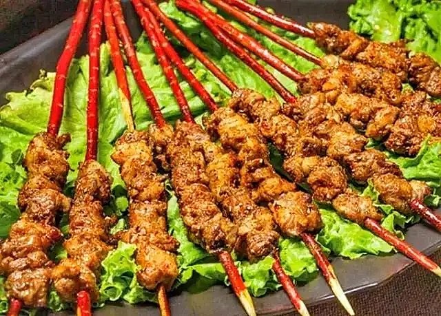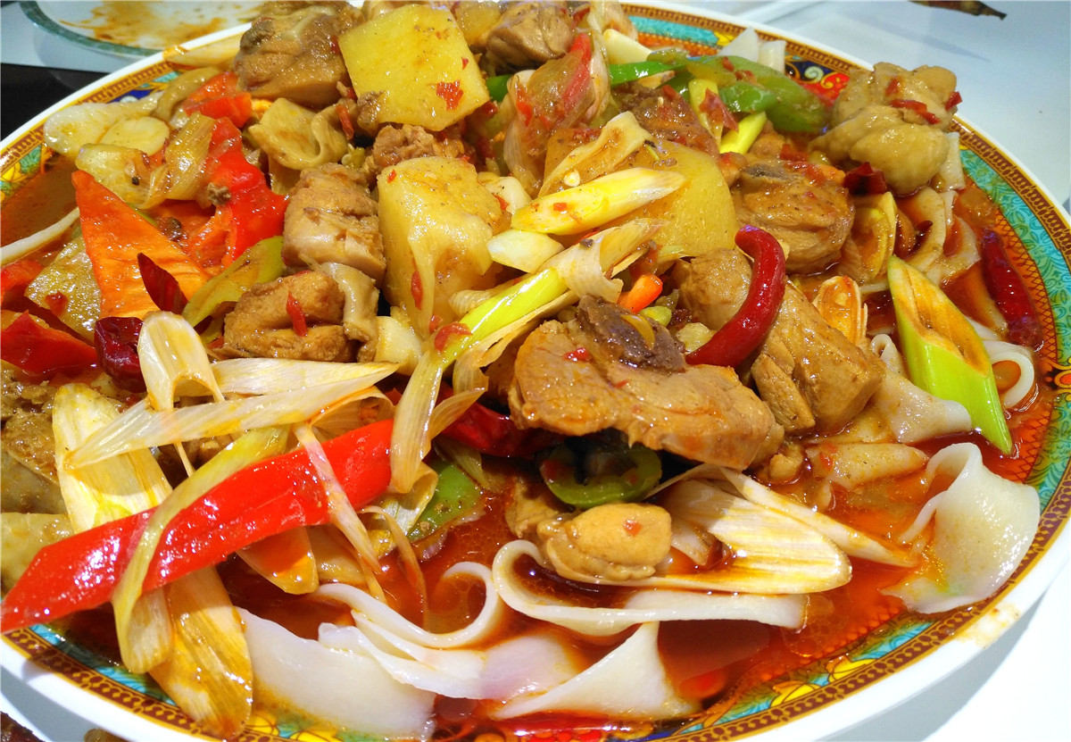 大盘鸡是新疆的特色菜,肉质鲜嫩的鸡肉配上彩椒,鲜红的菜汁,还没张嘴就闻到辣辣的味道,好一副张扬的样子,不禁让人食欲大开。盘中裹挟着浓郁鸡汤的宽面更是让人领略了这道菜的醇厚滋味。红柳肉串是新疆清真餐厅的代表作,弥漫着孜然和辣椒味道的肉串,吃起来香喷喷,油滋滋,真解馋。大快朵颐后,再尝尝他家的包包菜炒鹰嘴豆和手掰豆腐两道素菜,咸香有味,吃着顺口。