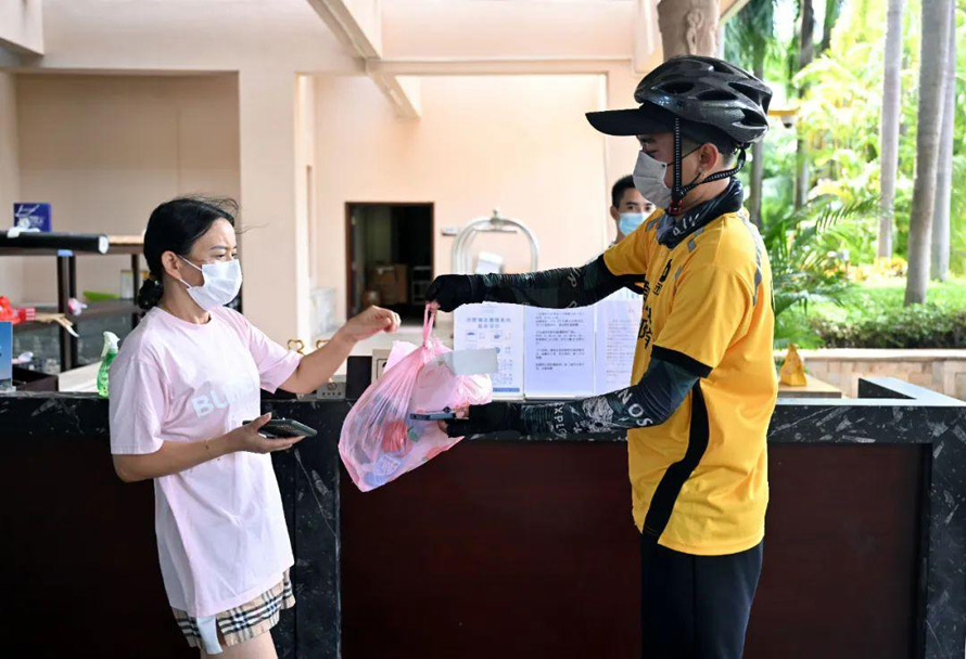 ▲8月7日,游客在三亚一家酒店门前取外卖。图/新华社