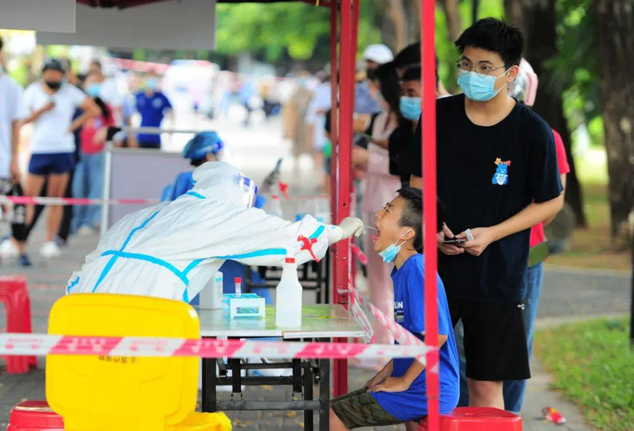 ▲8月4日,在海南三亚,居民排队进行核酸采样。图/新华社