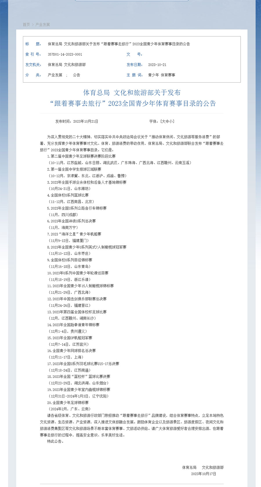 10月21日,国家体育总局、文化和旅游部联合发布“跟着赛事去旅行”2023全国青少年体育赛事目录,推动体育休闲、文化旅游等服务消费,充分发挥青少年体育赛事对文化、体育、旅游消费的带动作用,鼓励体育企业以及旅游景区、旅游度假区、夜间文化和旅游消费集聚区等文化和旅游场景不断丰富体育赛事、文旅活动供给。