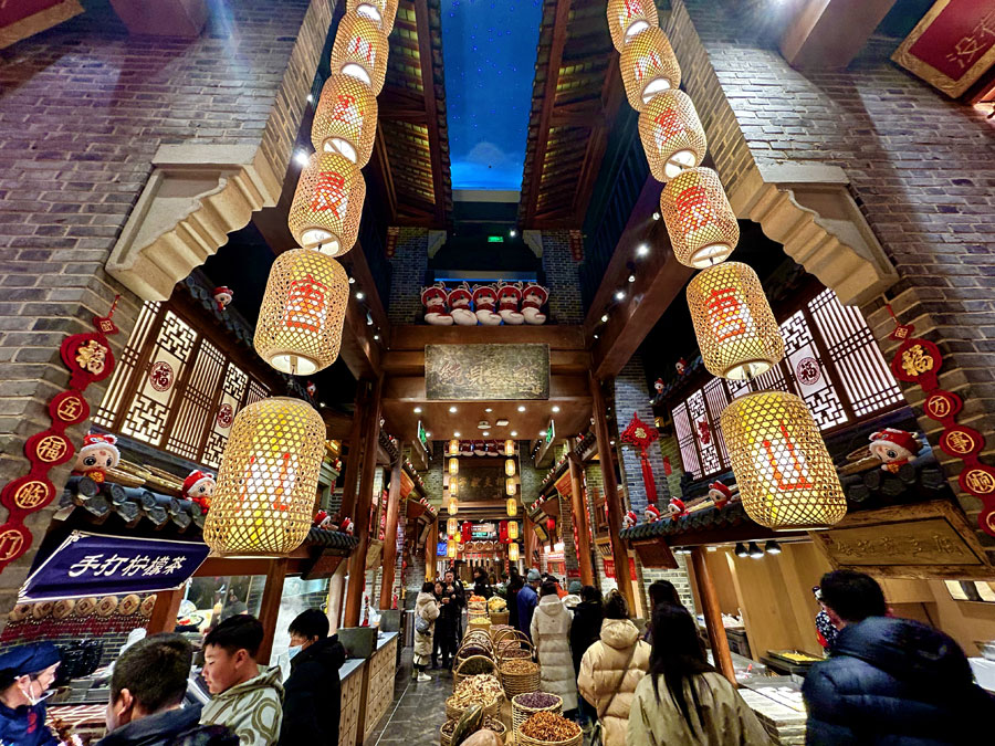 作为国内最大的原创沉浸式室内特色餐饮微度假体验地,一进门,你就会被唐山宴陈列的银壶、剪纸等老物件所吸引。走过小桥流水,“梨园盛世”的戏台上,皮影好戏正在上演。小道、街巷各色美食令人垂涎欲滴,摊档叫卖声此起彼伏,老饕食客等号排队,一派市井繁华的景象真实地呈现在眼前。在这里,有唐山传统地方名点麻糖、棋子烧饼,也能吃到十四王爷烧鸡、香酥烤鸭、大枣驴、海鲜盛宴,150余种极具唐山风味的特色小吃和10余种非遗传承人美食让游客忍不住买买买。