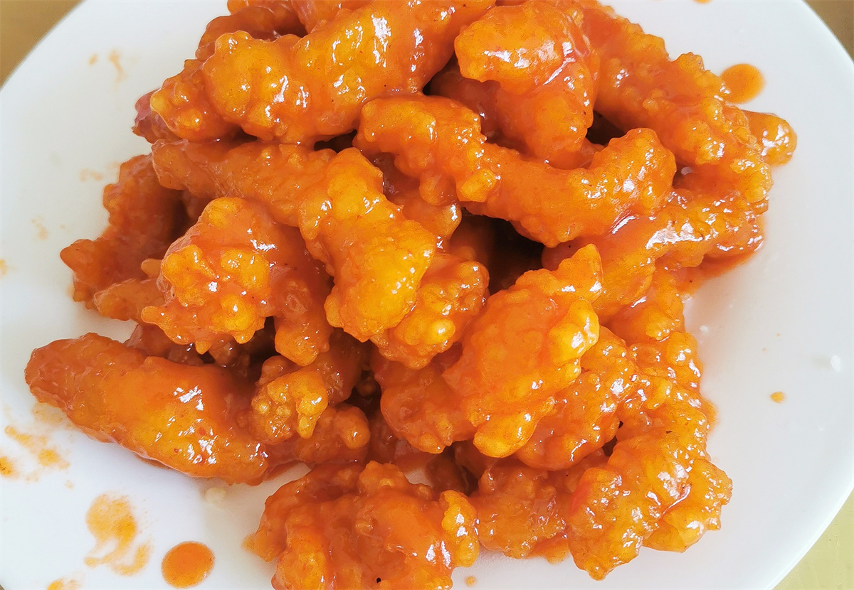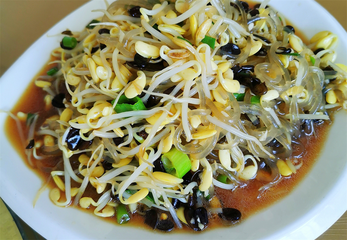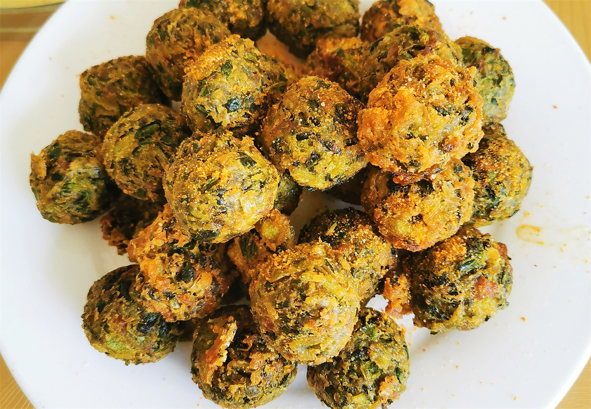 最让人感到新鲜的是野菜坨子和炸野菜丸子。野菜坨子是野菜混着白面摊成的软饼,蘸上大蒜醋汁,入口糯软,酸、辣、鲜、香交织;油锅炸过的野菜丸子,焦香扑鼻。小葱摊鸡蛋嫩黄鲜香,黑豆芽拌粉条清爽利口,新鲜食材自带的质朴味道,吃起来格外对味。小外孙子点的糖醋里脊酸甜适口,小家伙吃得津津有味。