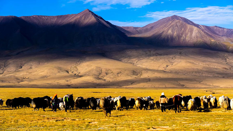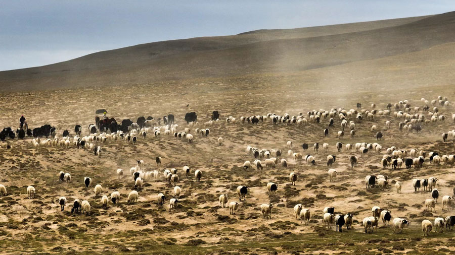都兰县位于青藏高原腹地的柴达木盆地,拥有草原面积38 11.04万亩,其中天然牧草地3711.7217万亩:其他草地98.914万亩,人工牧草地0.4046万亩,草原综合覆盖度为52.97%。 9月中旬全县123.3088万牛羊转场完成,都兰县是青海省畜牧业资源大县。为顺应牧草生长周期与气候规律,当地牧民延续千年传统,实行季节性轮牧。(摄影/先宫 希日尖措)