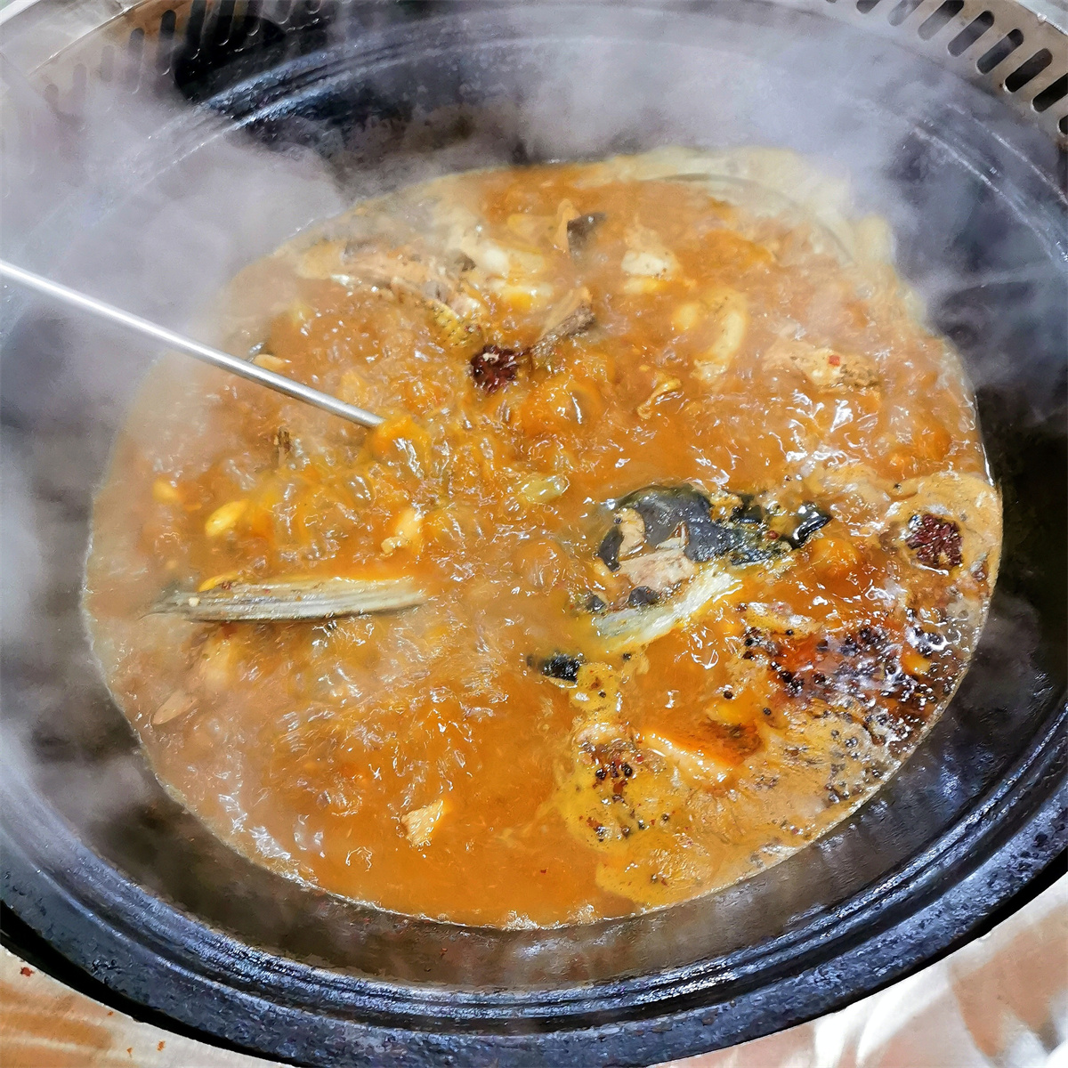 这家店的主打便是铁锅炖鱼。木桌上架着一口巨大的铁锅,处理干净的鲜鱼下锅后,点火“侉炖”。没一会儿,浓郁的鱼香味就漫了出来,炖出的鲜汤更是精华——涮上几片绿叶菜、脆嫩的莲藕、清爽的白菜、软嫩的豆皮,再加上鲜美的平菇,一口下去,鲜爽劲儿直冲天灵盖,那叫一个过瘾。