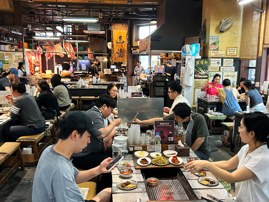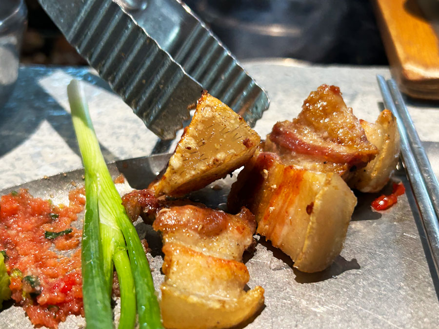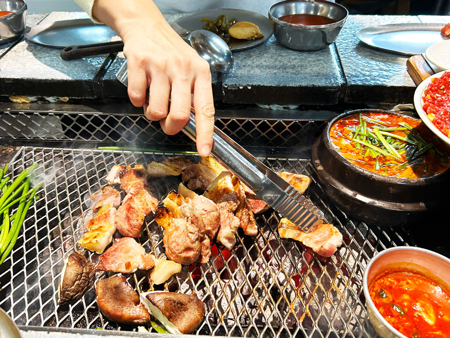 食客们围坐在烤炉旁,亲自将肉片放在炭火上翻烤。随着温度的升高,肉片逐渐变色,散发出诱人的香气。当肉片烤至金黄酥脆时,轻轻夹起,蘸上一点韩国特有的酱料,然后包在生菜叶中,一口咬下去,那是一种满足感与幸福感的完美融合。