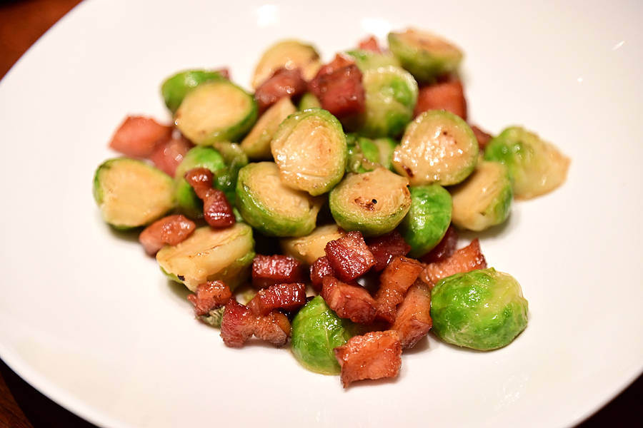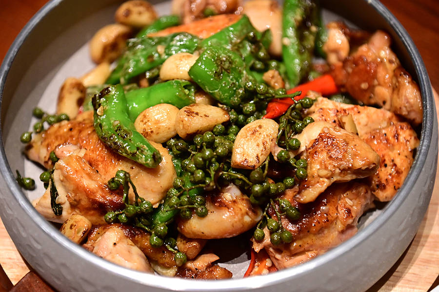青藤椒炒去骨三黄鸡、樟树港辣椒炒香茅牛肉粒、咖喱虾、厚培根煎孢子甘蓝,都太好吃啦!