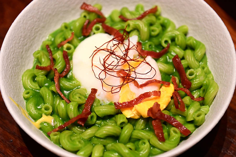 绿咖喱培根通心粉配温泉蛋,通心粉QQ弹弹,温泉蛋嫩嫩滑滑,培根咸咸香香,一会就瓜分一空!