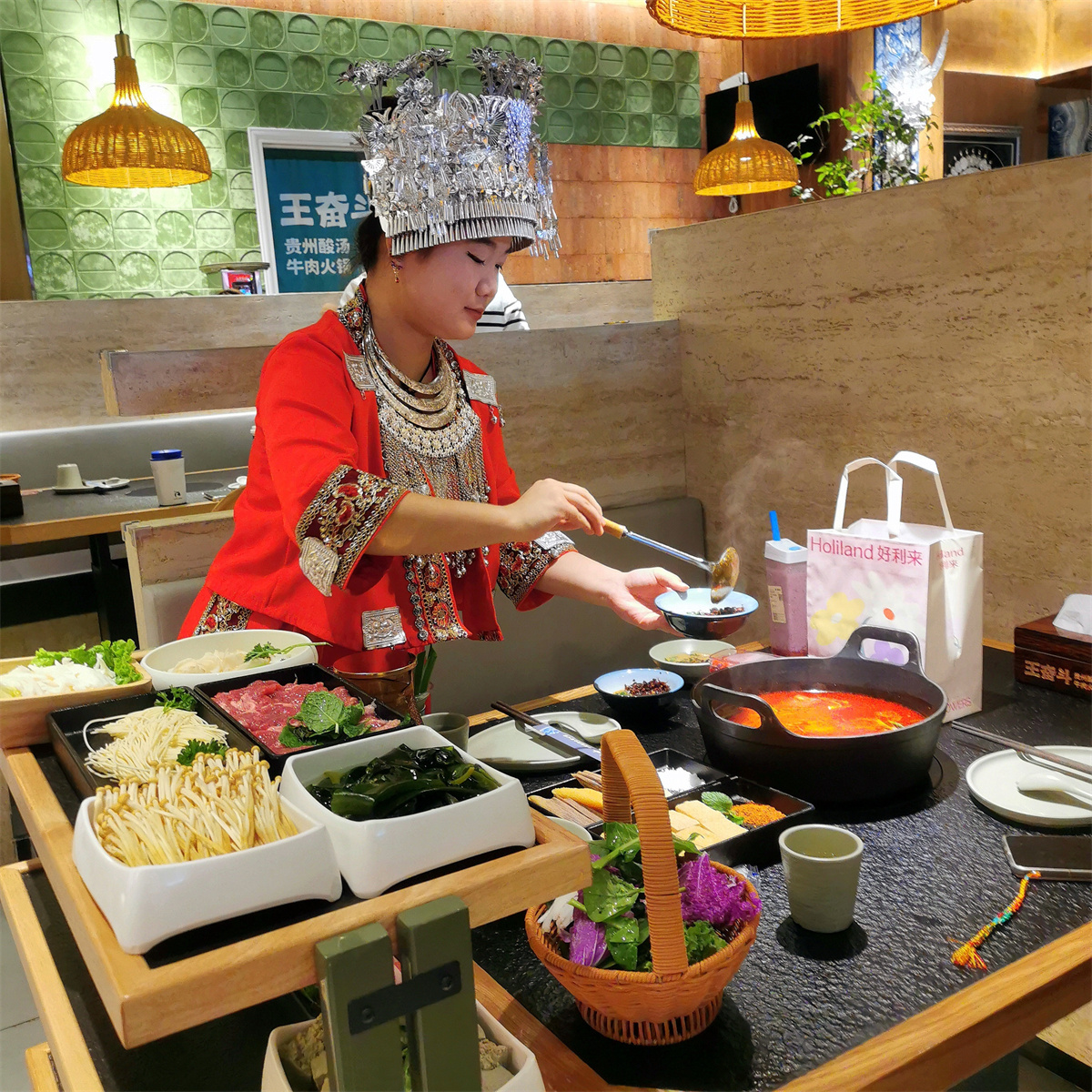 锚点逛房山龙湖天街,刚踏进商厦大门,“王奋斗贵州酸汤牛肉火锅”的广告便撞入眼帘。刹那间,八年前在贵州黔东南州西江千户苗寨古街的记忆汹涌而来——苗年节时的热闹场景仍历历在目,身着绚丽民族服装的苗家兄弟姐妹载歌载舞,几百米长的长桌宴上,酸汤牛肉火锅正冒着滚烫的热气。