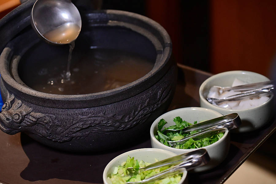 开锅高汤,古色古香的大鼎,一开盖就香气四溢,先喝一碗热气腾腾香浓醇厚的高汤,无比舒畅。