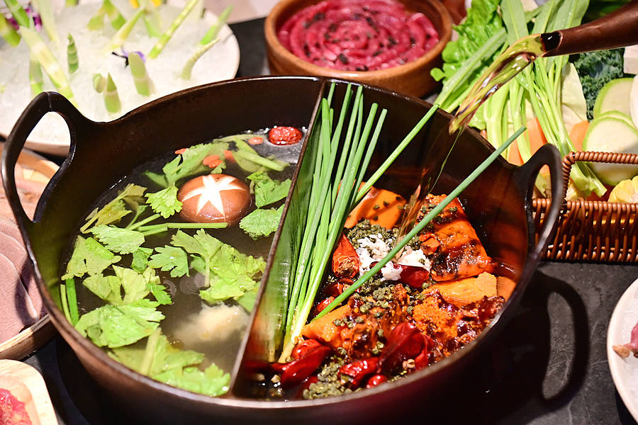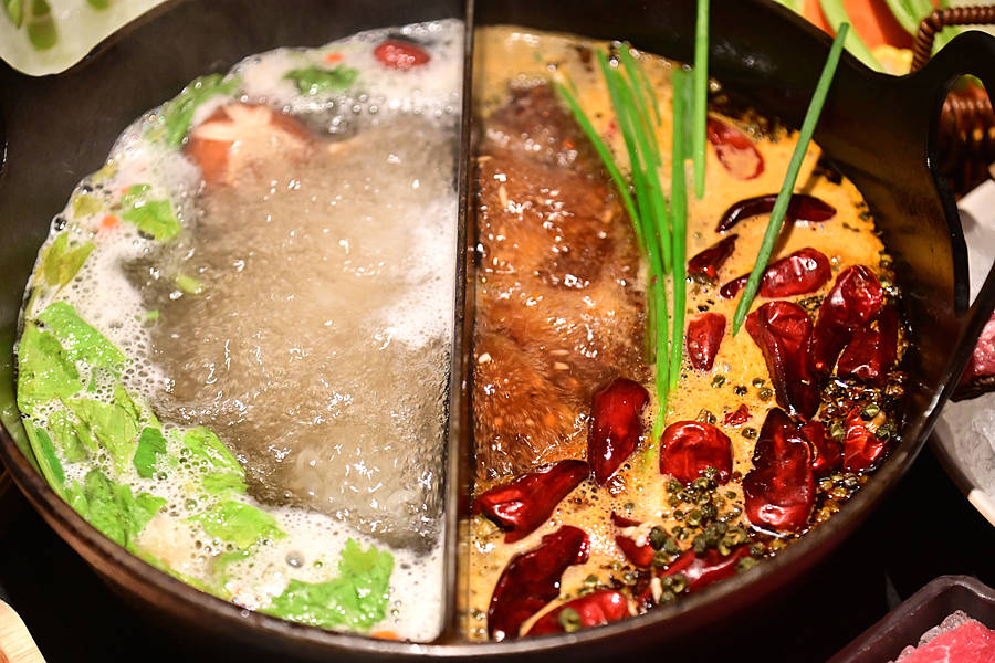 非遗双汤锅,一边是草本原汤,汤方传承四代一百多年,牛骨、牛腱、牛舌、牛蹄筋和十几味草本植物精心熬制,滋补润肺,一边是家传红汤锅,加入老鹰茶做汤底,香辣不燥越煮越香,养生和重口党都满足~