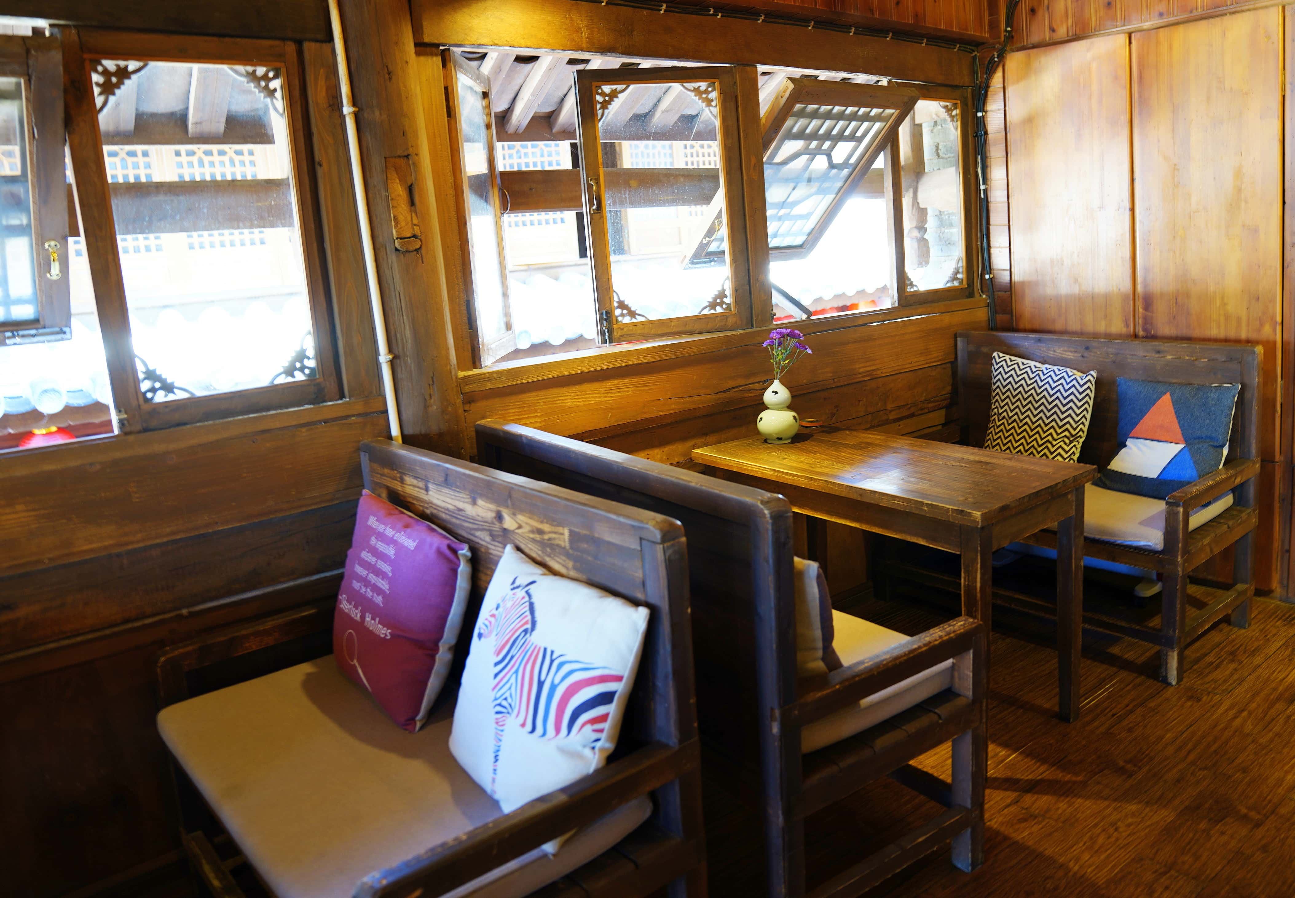 店内环境雅致又透着古朴气息,一张能容纳十人的大桌旁,摆满了各式装饰物与图书,你可以约上三五好友,边聊边品咖啡,也能独自静坐,翻几页闲书打发时光。靠窗的一排卡座位置绝佳,探出头去,对面的店铺、狭长的街巷尽收眼底,恍惚间竟生出几分异域韵味。