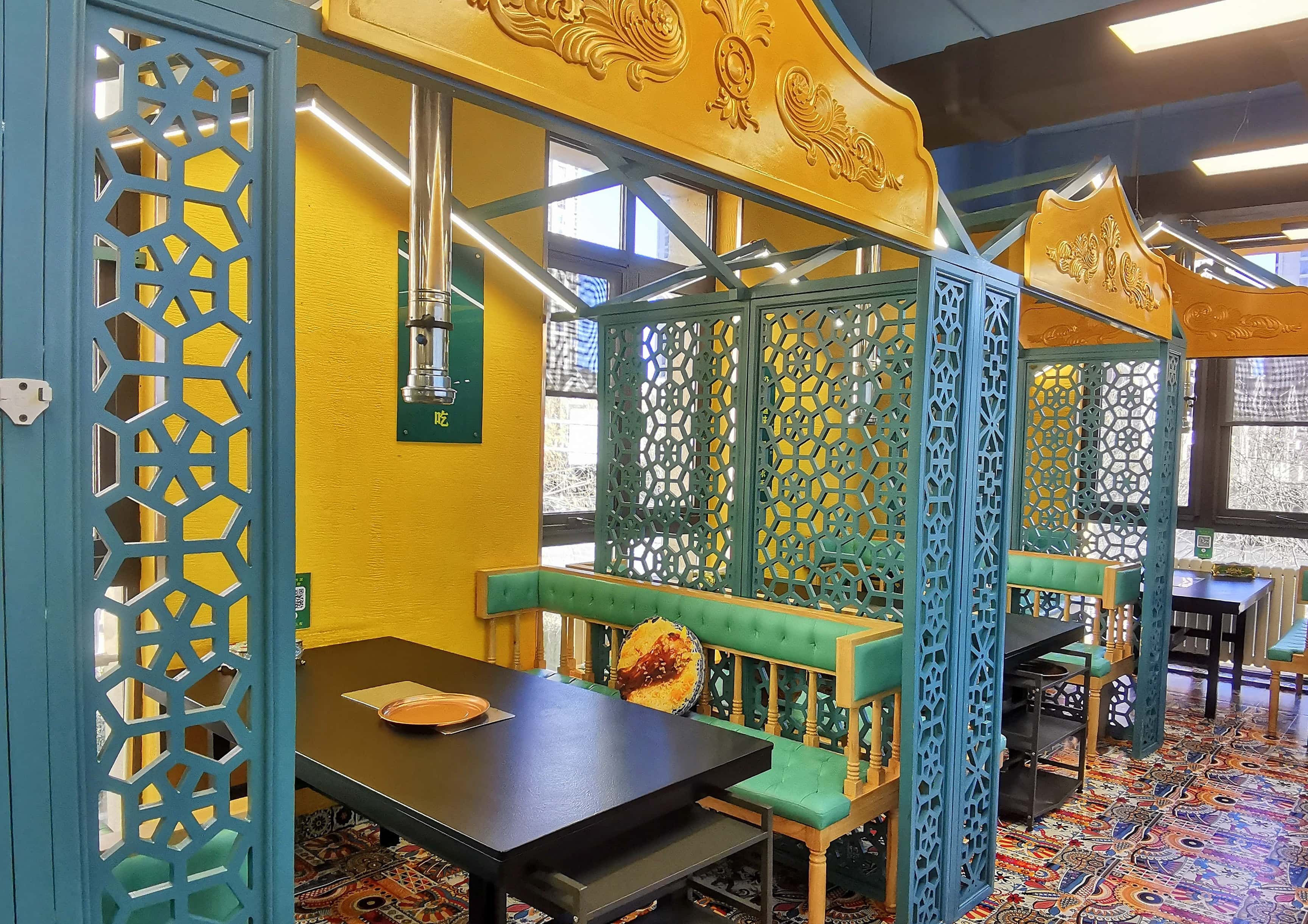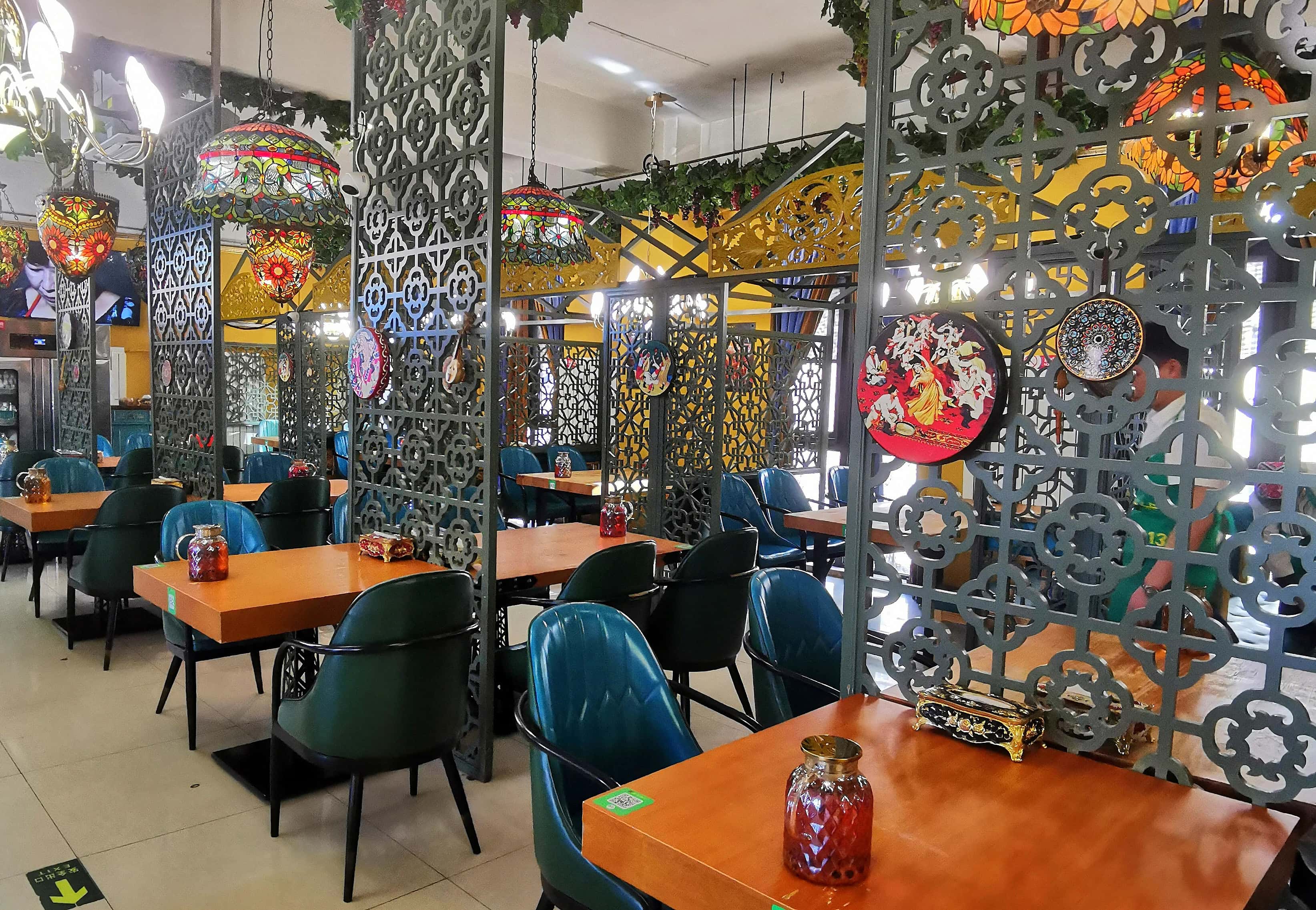 推开店门,浓郁的新疆风情瞬间包裹全身。大堂与包间设计各有韵味,既有简洁明快,透着家常温馨;又有繁复细腻,雕刻着新疆特色纹样;耳畔循环的维吾尔族民歌,搭配随处可见的民族元素装饰,让人恍若穿越千里,置身于伊犁河畔的风情小店。