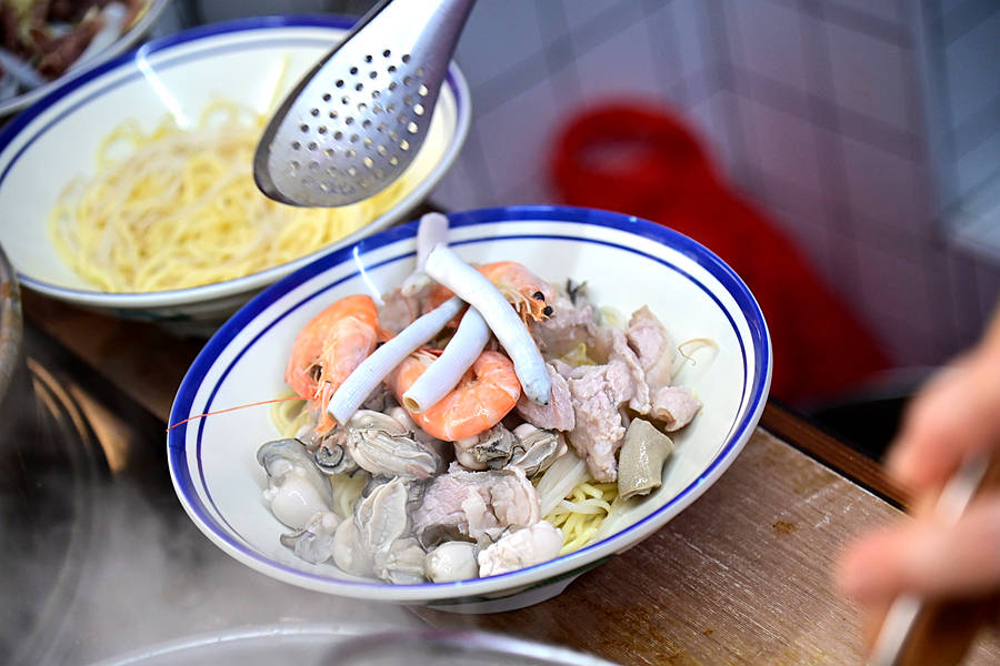 店员大姐将食材和面条在高汤中烫熟后盛入碗中