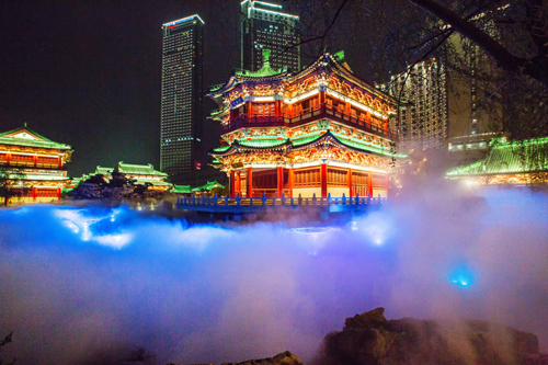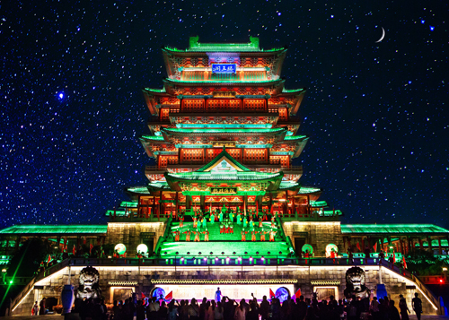 在入口处的一张巨大的宣传板上,有一段剧情简介,大概是说《滕王宴乐》是南昌首个实景化、沉浸式、体验型的夜游演艺游园项目。她以夜秀灯光为底色,以滕王和月娥的爱情故事为背景,以大唐礼邦为主轴,通过器乐、舞蹈、融合全息技术和水幕秀等时尚科技,为游客再现了大唐盛世繁荣场景,让游客沉浸其中,深度体验大唐滕王画意生活。