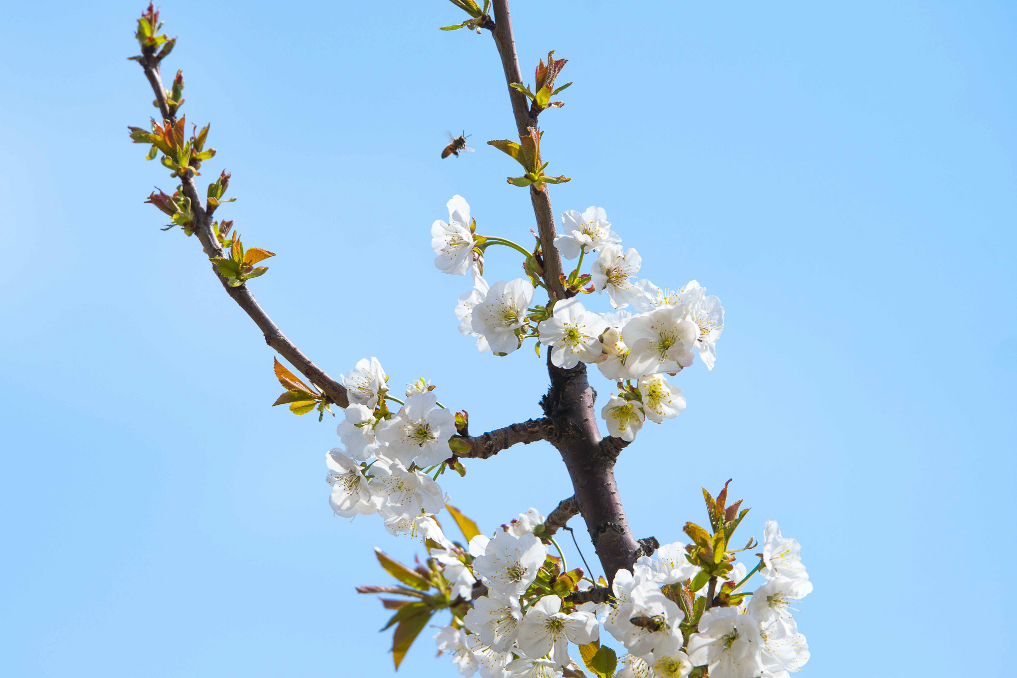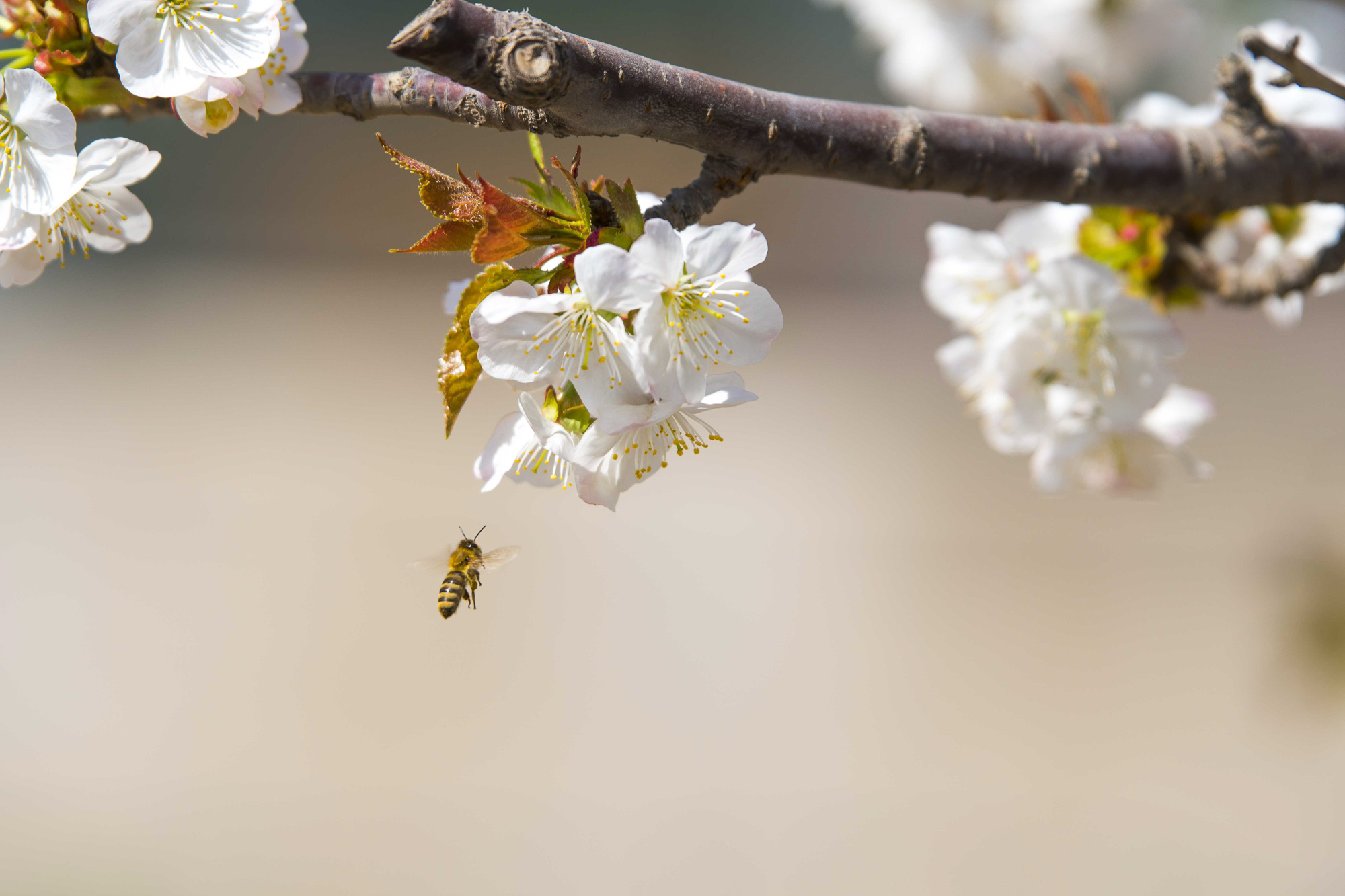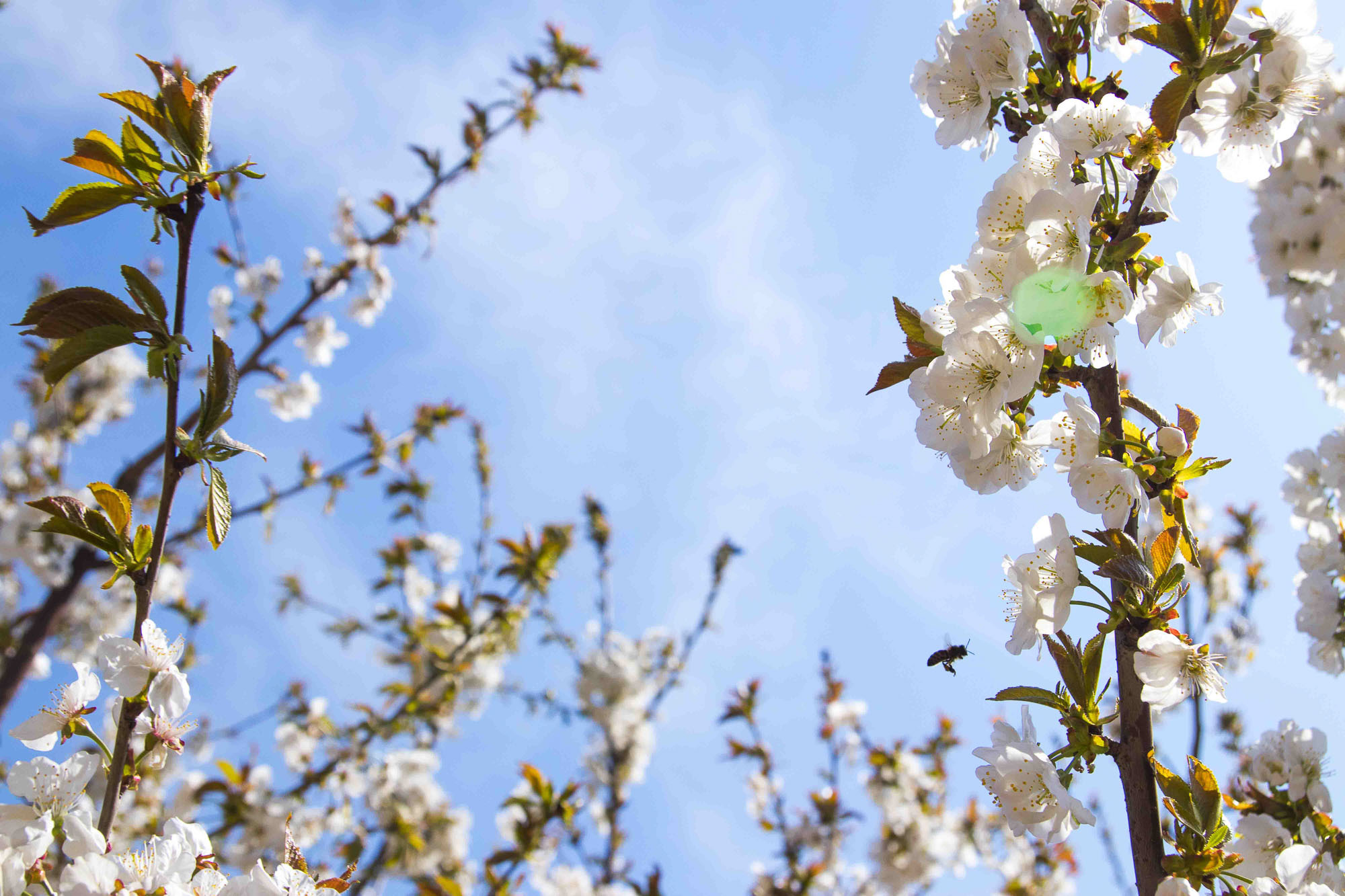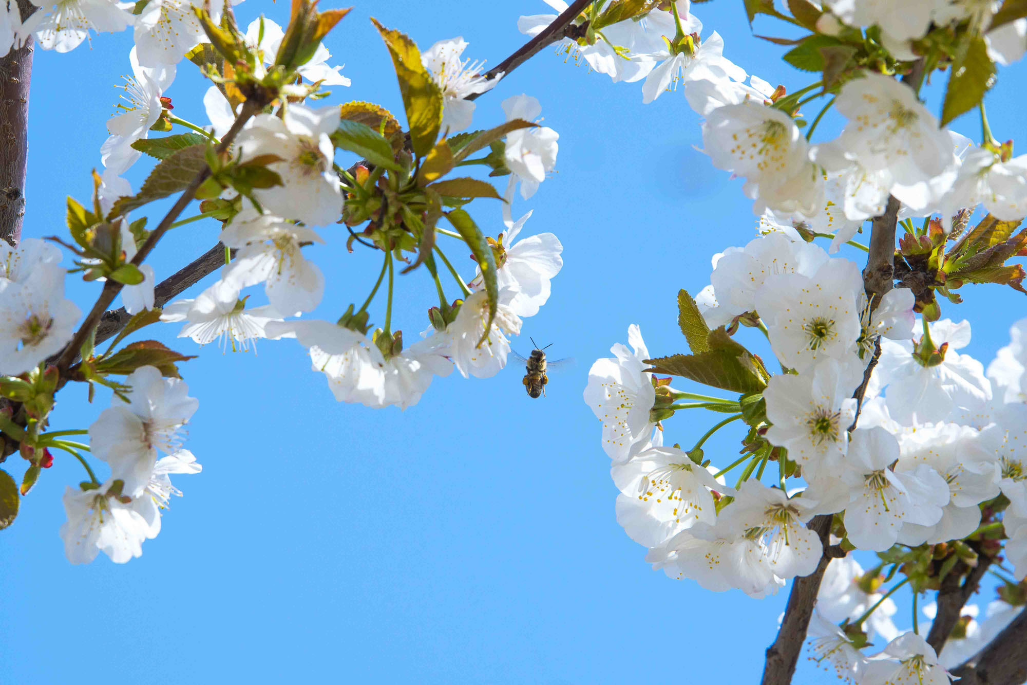 这里的樱桃树是用了有机方式种植的,除草靠鹅,授粉靠蜂。这里养了一百多万只蜜蜂为樱桃花授粉,小蜜蜂在一树树的花朵间穿梭忙碌着,采蜜的同时将花粉从一朵花蕊带到另一朵花蕊上。这种大面积规模化种植为授粉带来了方便,也让樱桃花蜜更加香甜。