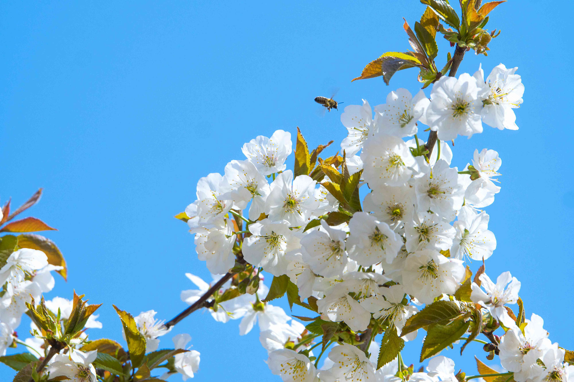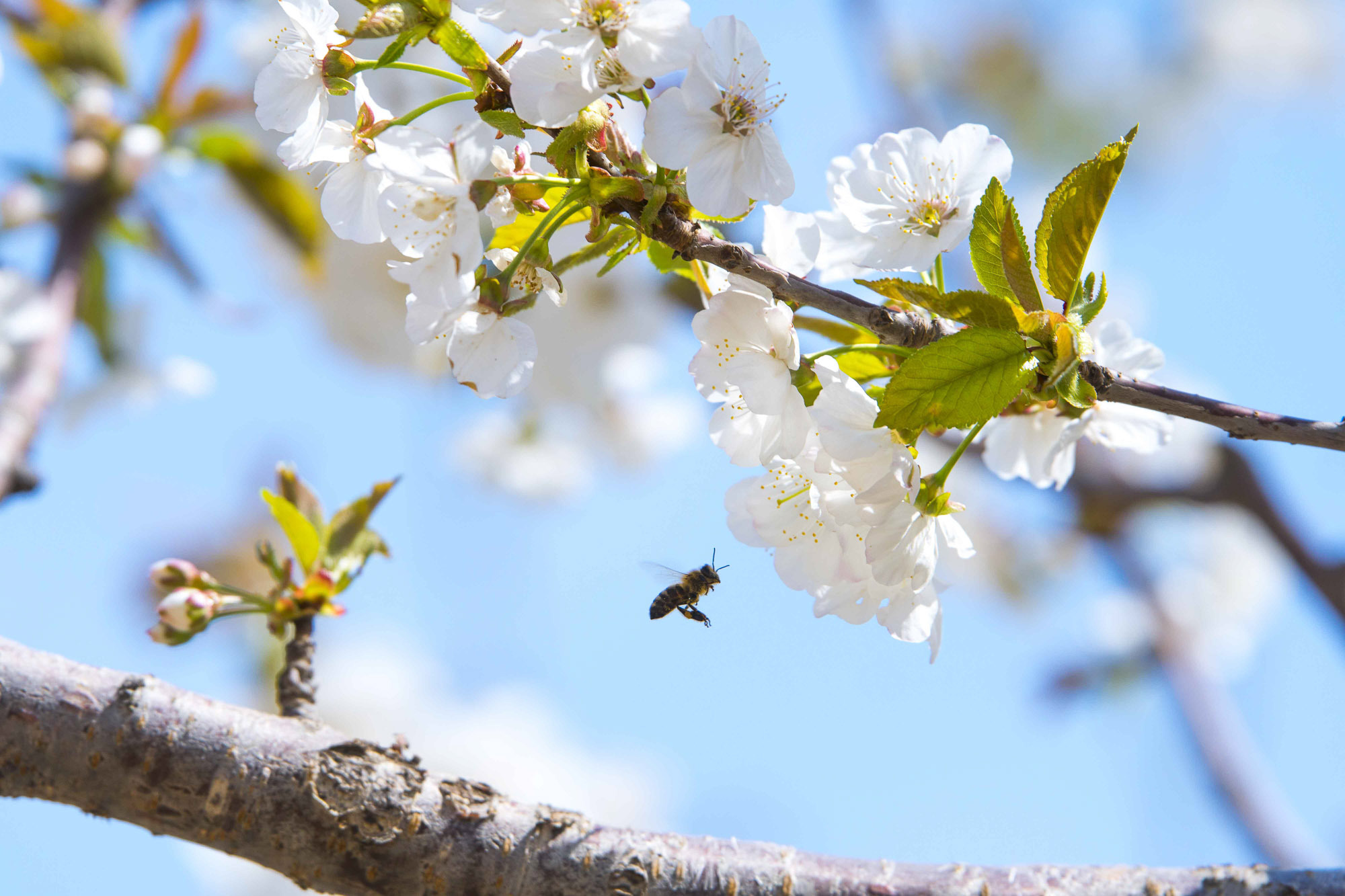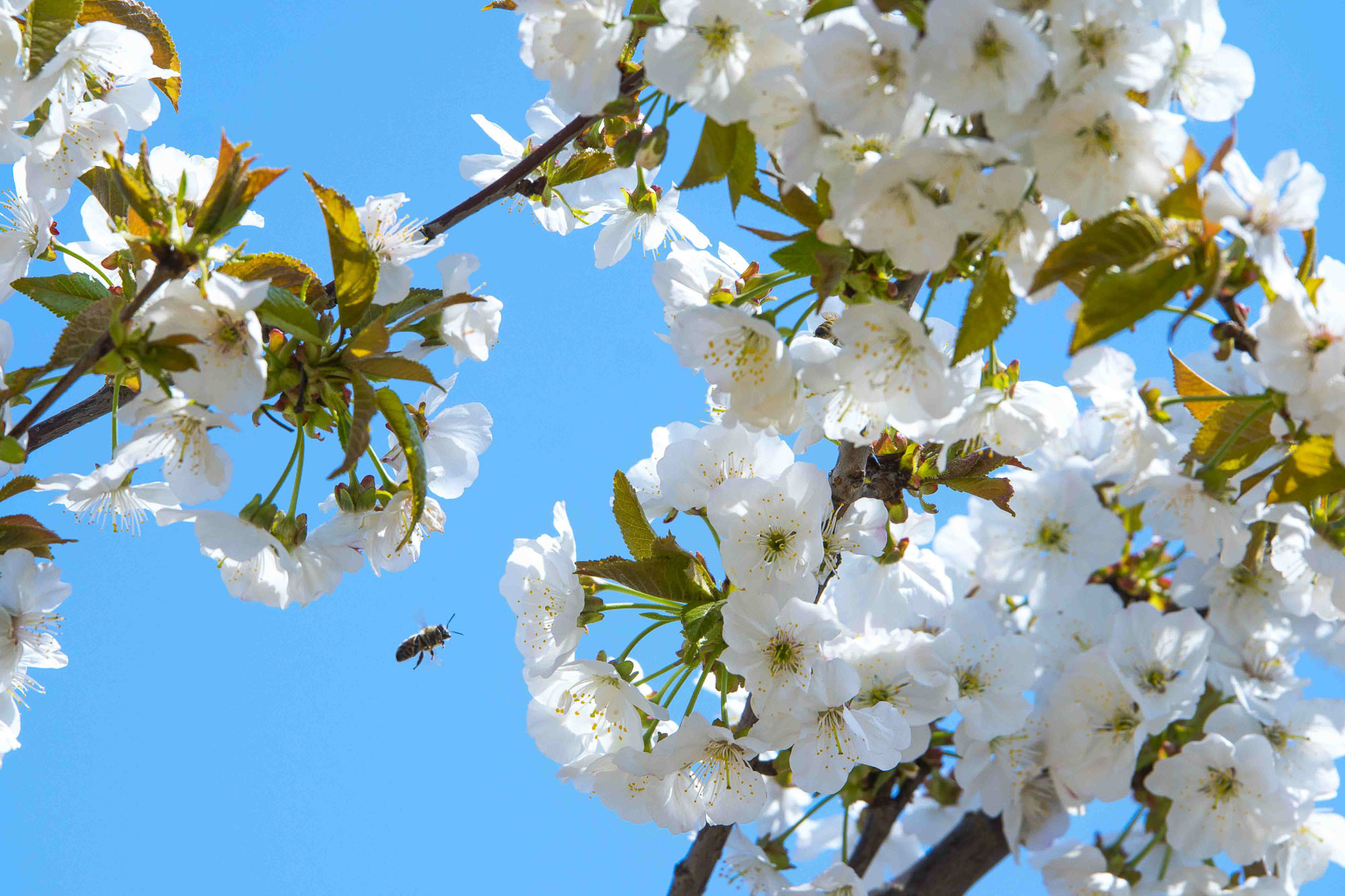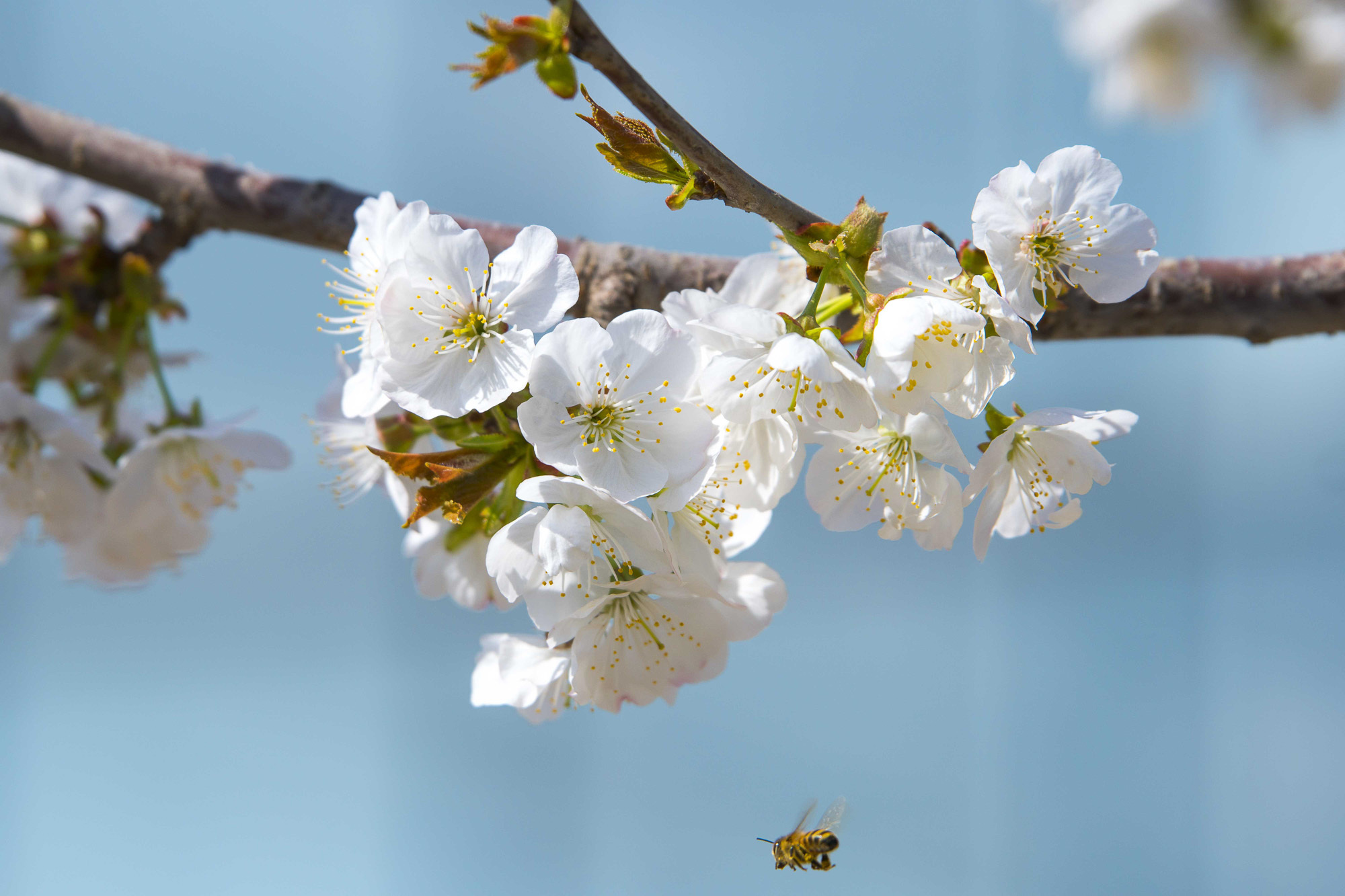 这里的樱桃树是用了有机方式种植的,除草靠鹅,授粉靠蜂。这里养了一百多万只蜜蜂为樱桃花授粉,小蜜蜂在一树树的花朵间穿梭忙碌着,采蜜的同时将花粉从一朵花蕊带到另一朵花蕊上。这种大面积规模化种植为授粉带来了方便,也让樱桃花蜜更加香甜。