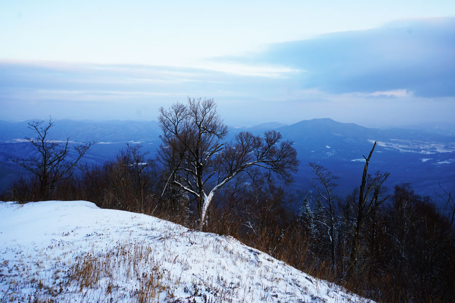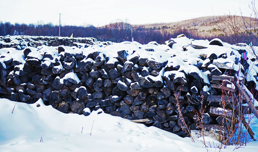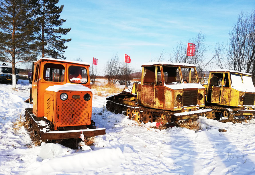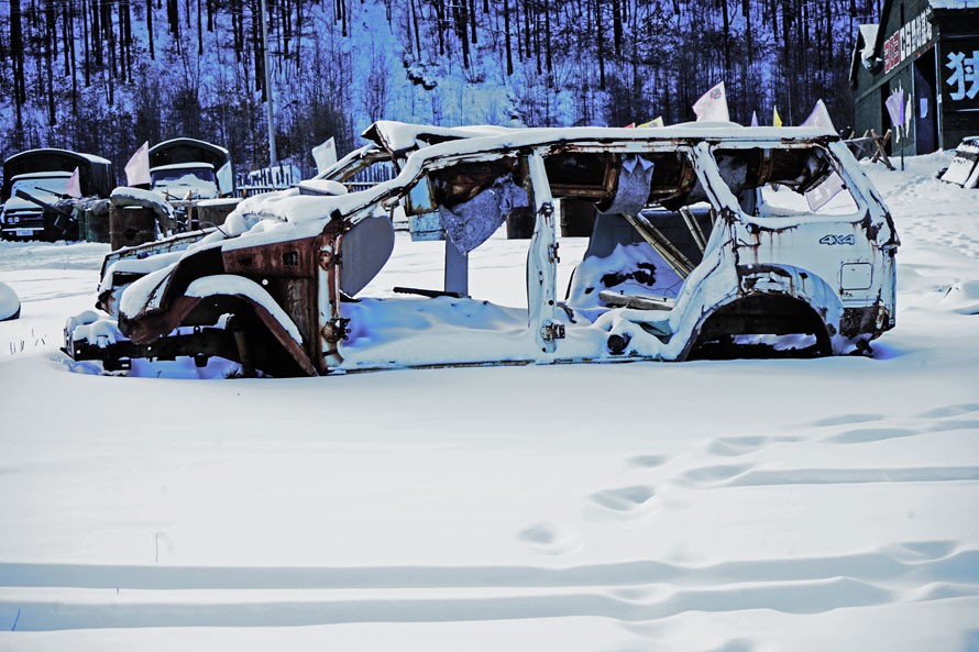 视线内,三五辆废弃了的运输木材的卡车和拖拉机已被岁月晕染,锈迹斑斑中透着久远的沧桑,卡车后面是一大片堆砌整齐的木材,在霜雪的覆盖下依旧能清晰看到它们的壮硕与挺拔。