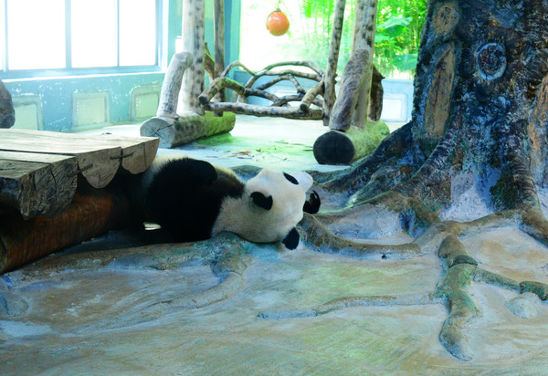 面对媒体采访群,大熊猫显得很懵圈,久久不愿露面,呆萌可爱。