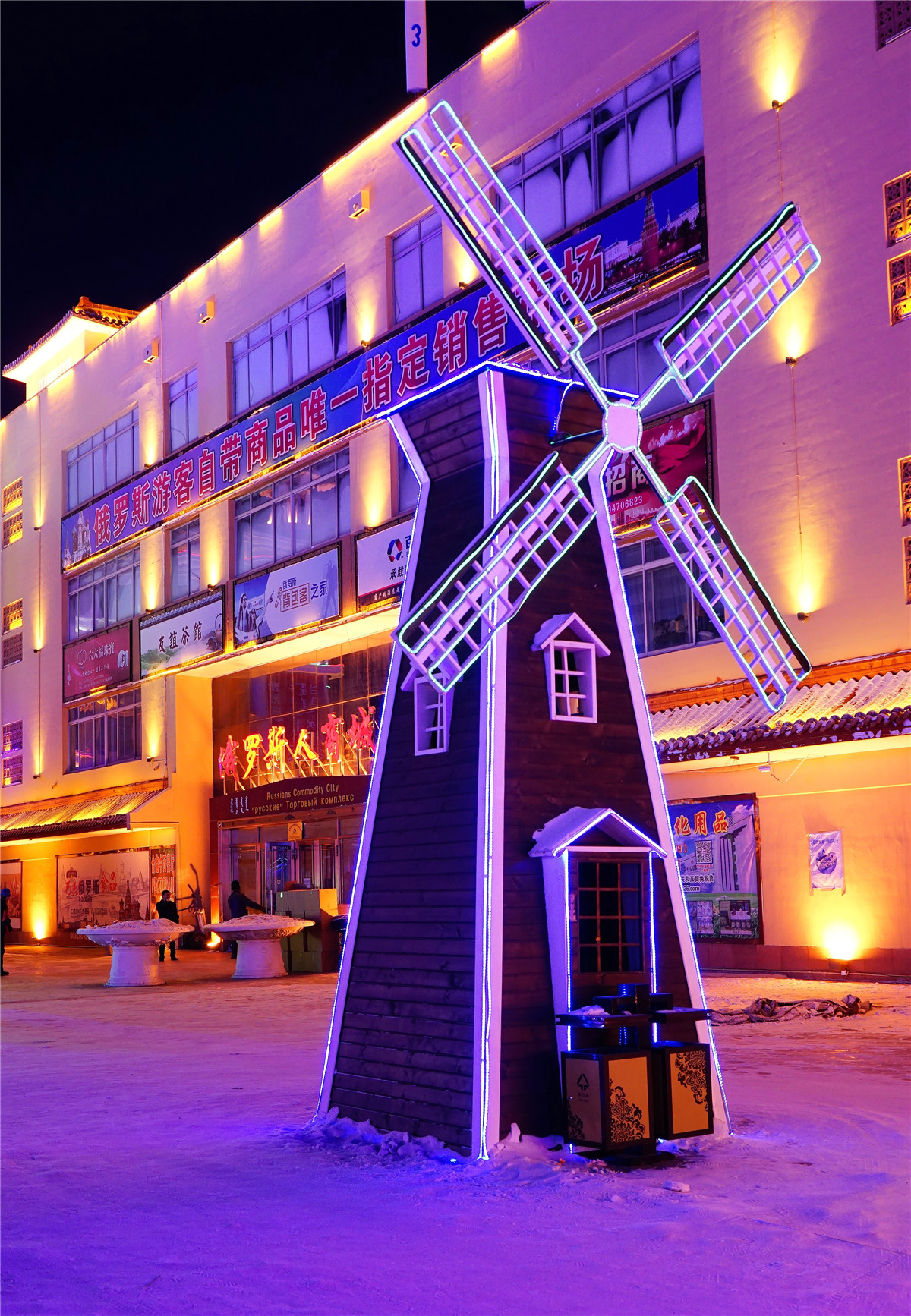 随着冬季冰雪的到来,城市中的中国俄罗斯互市贸易区成为冰雕展示区,形态各异的冰雕群反映了不同的主题。特别是夜幕降临的时候,晶莹剔透,五光十色的冰雕艺术吸引着人们的目光。