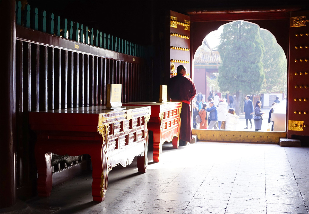 在法轮殿东边的班禅楼里,专门设有藏传佛教艺术博物馆文物展室,从这里可以了解藏传佛教文化。同京城其他寺庙一样,雍和宫从进门的牌坊到昭泰门之间,有许多银杏树,赶上深秋时节,这里也就成为摄影人创作的场所。