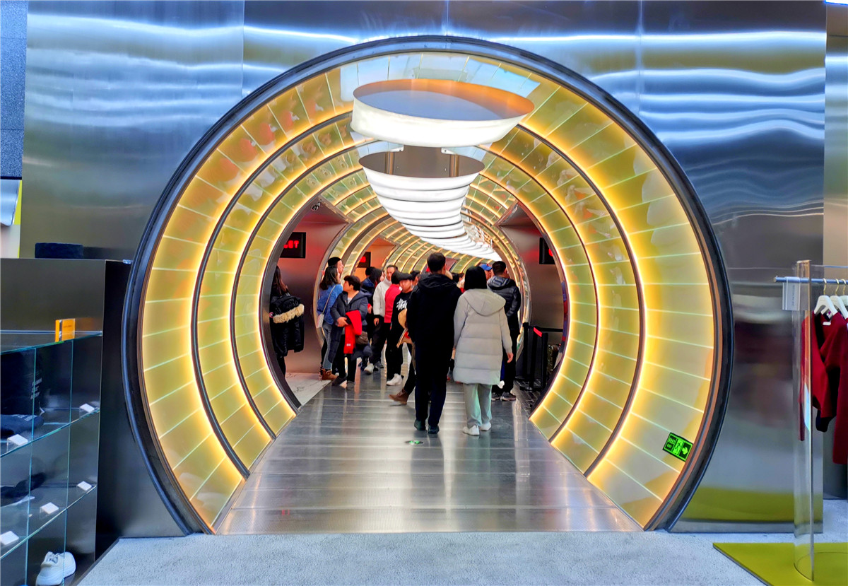 一条具有强烈景深感的时光隧道,成为人们光顾的景点,每天来这里观光体验的游人络绎不绝。奇特的灯光效果,让每一个走进时空隧道的人们都会产生一种神思恍惚的感觉。人们凝视着隧道墙壁上形态各异的自己,整不明白是在某家游乐场娱乐呢?还是在长安街上逛商场?