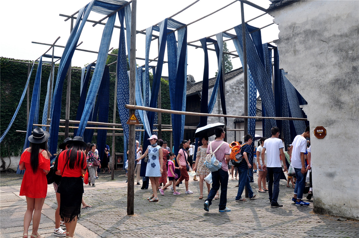 宏源泰染坊迎风招展的蓝印花布,以白米、白面、白水酿造的三白酒坊,守着河边的茶铺,呈现给你不同的体验。在三白酒坊我们听到这样一个故事:一位在帮别人家做工的孝子,得到雇主给的两个粽子,想起家中老母亲就将粽子藏在一个老树洞里,并顺手扯了一把草遮住洞口。天下大雨,孝子走得匆忙,忘了取粽子,等想起来取时,粽子已经被雨水草汁浸成软乎乎的了。孝子将两个软乎乎的粽子拿给母亲吃。没有想到外壳剥掉后,立刻散发出阵阵香气,母亲忙问究竟,儿子想起上面盖了一层草。原来这是一种能使米食发酵的酒药草。后来这种做酒方法就流传开来了。