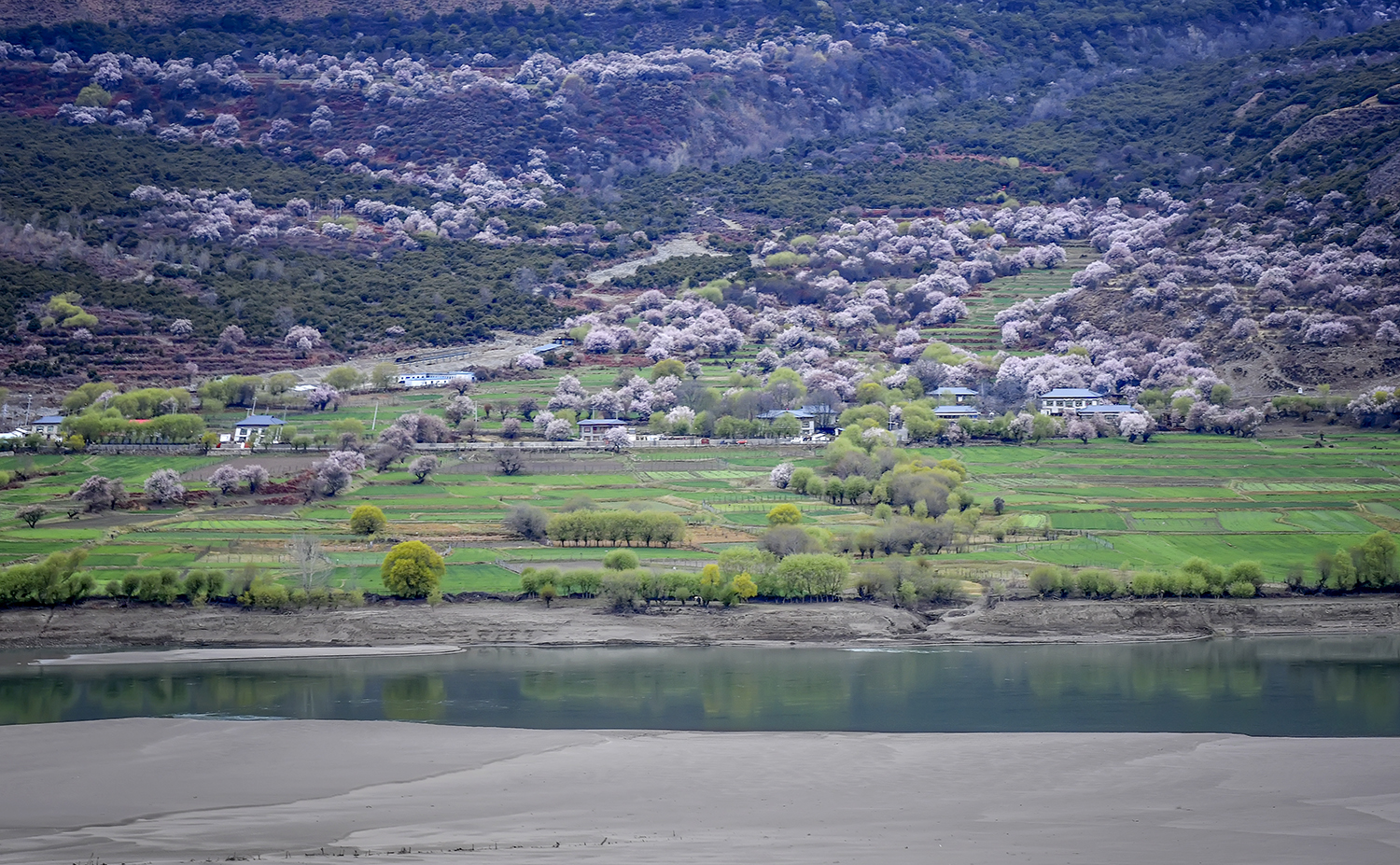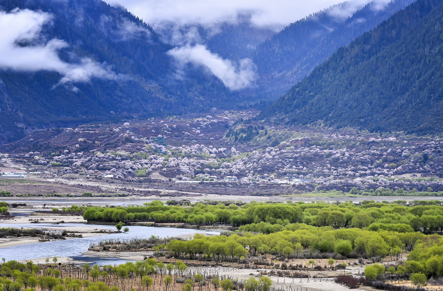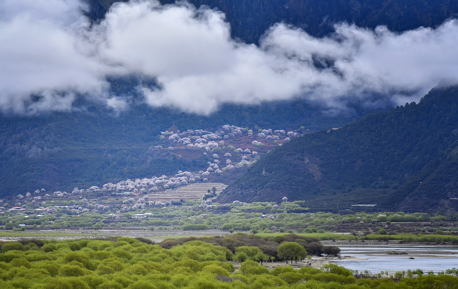 远处,天上的白云和山顶的积雪仿若耳语,山腰的云雾和黛绿的树木缠绵着情话,从山坳一直开到山脚的桃花,遥相呼应着河谷中柳林,那碧水畅快地流淌着,它又好似一只神笔,巧妙地勾勒出了一幅藏江南的画卷。
