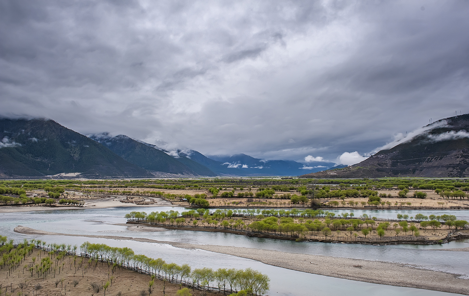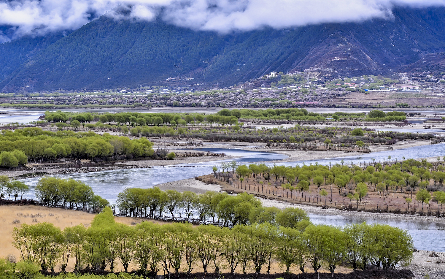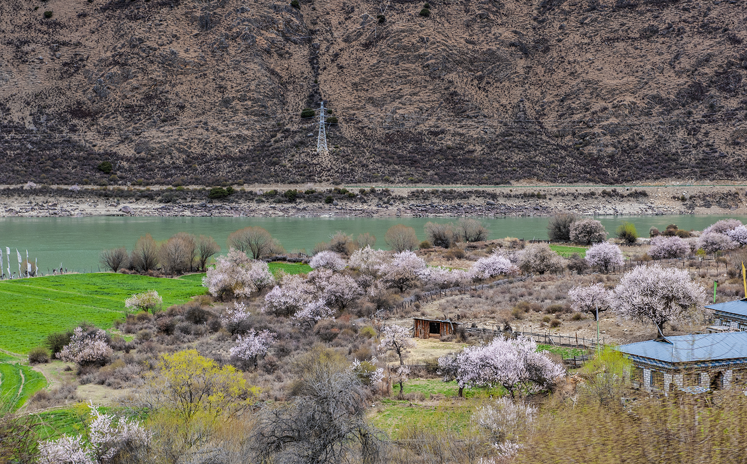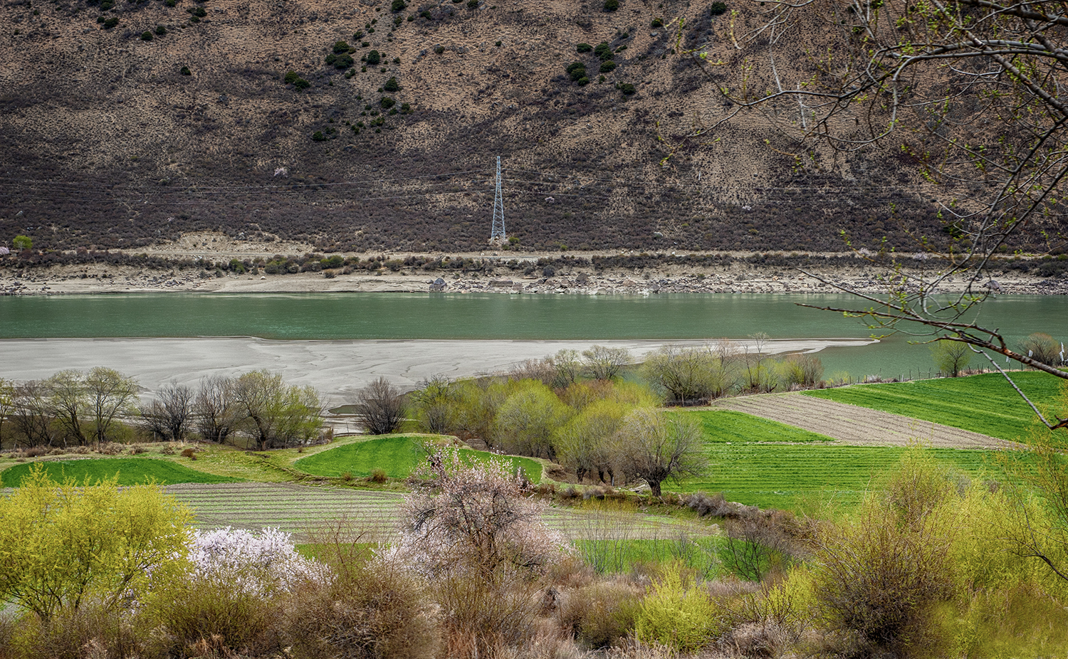 远处,天上的白云和山顶的积雪仿若耳语,山腰的云雾和黛绿的树木缠绵着情话,从山坳一直开到山脚的桃花,遥相呼应着河谷中柳林,那碧水畅快地流淌着,它又好似一只神笔,巧妙地勾勒出了一幅藏江南的画卷。