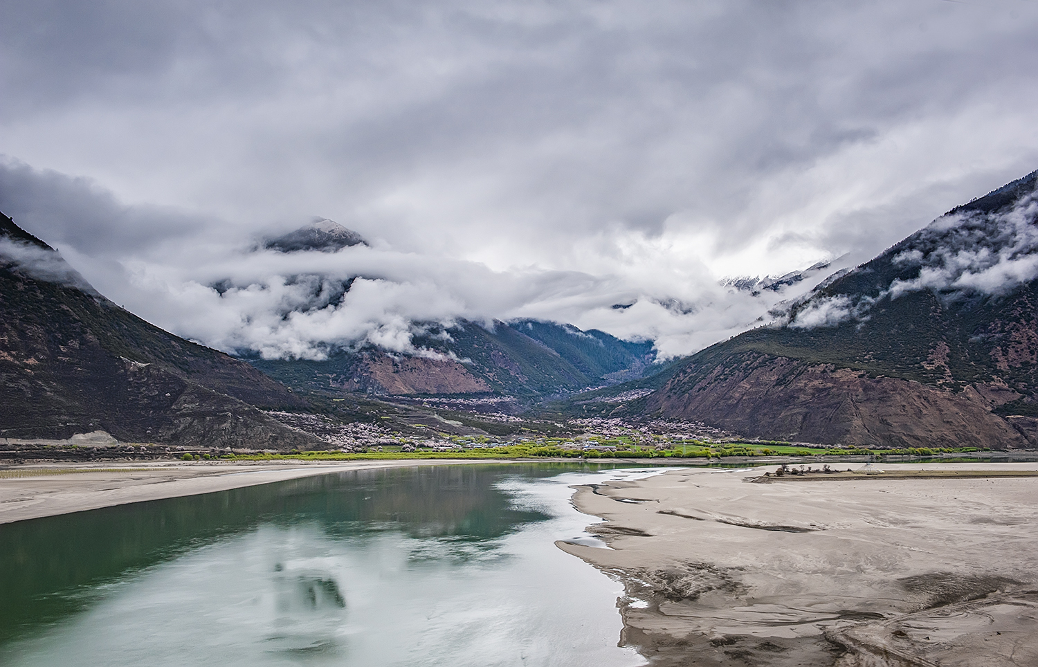 一条绿绸带似的河,蜷曲在天的那头世界最高的屋脊上,山坳之上是永远的高原蓝,山顶成了白云的常驻地,而桃花盛开的山谷是藏民的家园,尼洋河水眷恋着这片土地,它没有径直流过,而是多情地拐了个弯。