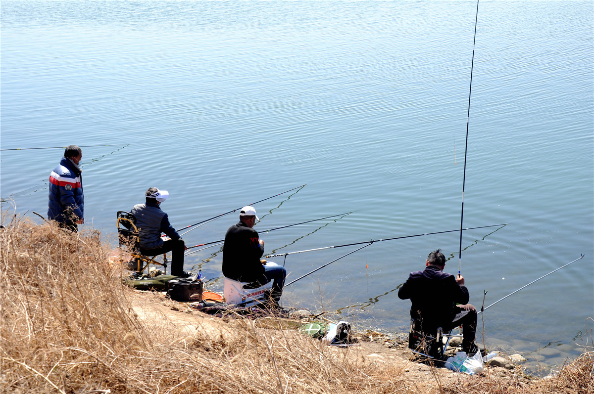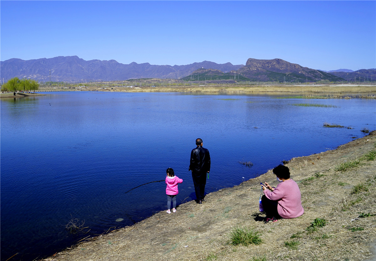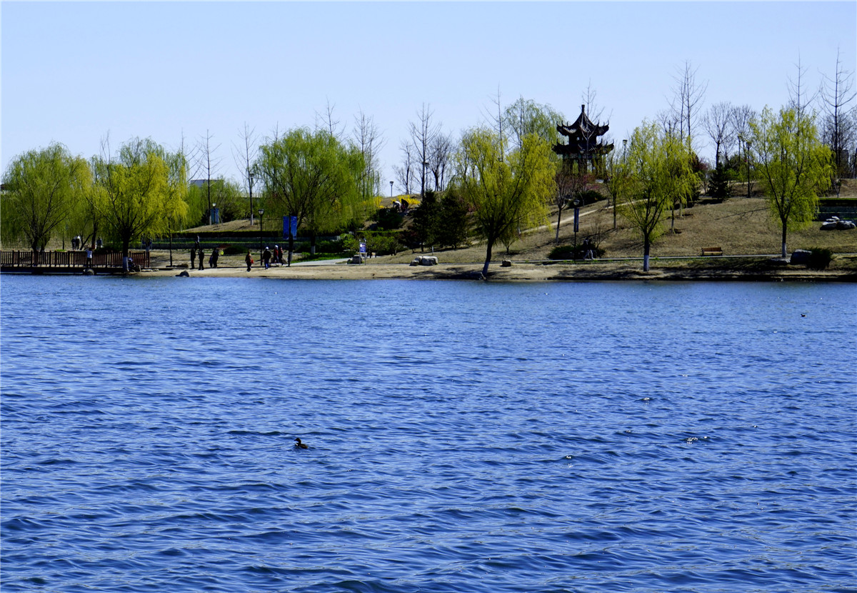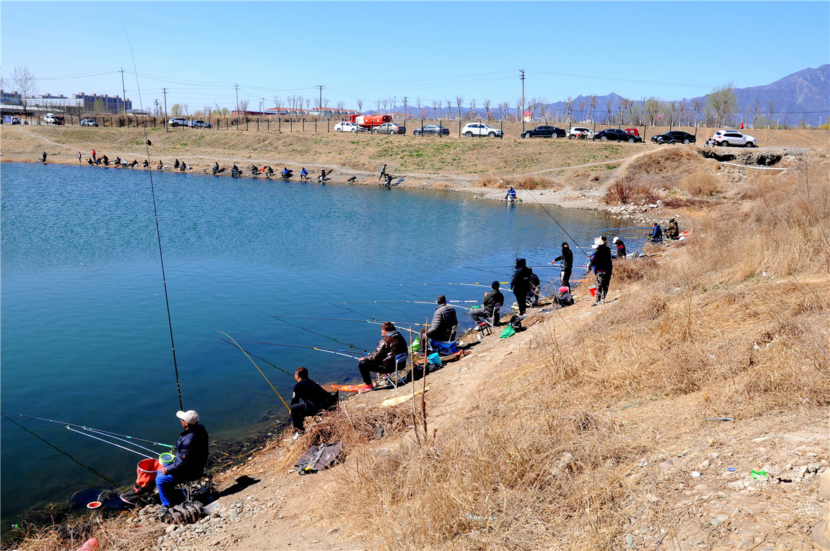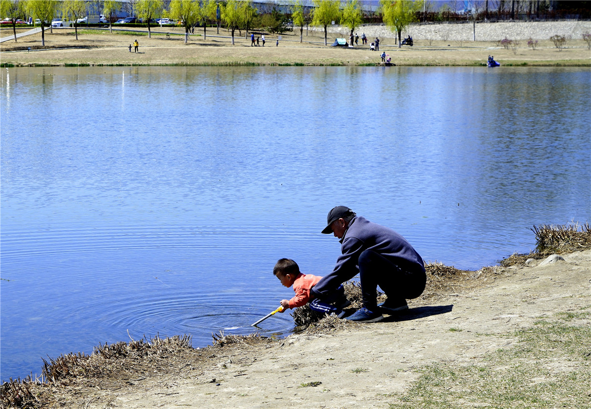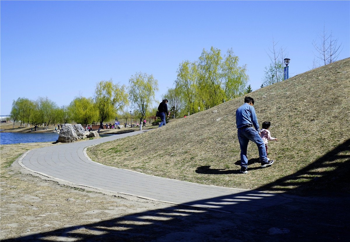 在公园深处,河畔上坐满了垂钓者。他们安静地盯视着水面上微小的变化,欣赏着远离喧嚣的蓝天、白云、山水画卷,陶醉在自得其乐的户外运动中。
