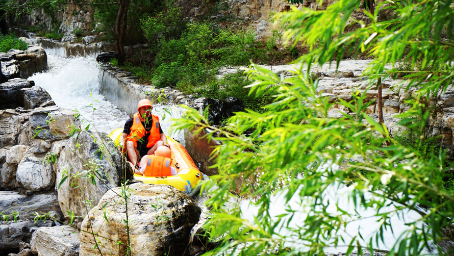 乐谷银滩的高山峡谷漂流全程长3.8公里,从起点到终点的落差达到了180米,每一段都惊险无比,数十个急速叠落的水道,让人惊恐又跃跃欲试,坐在皮艇里,人随艇飞,随水流的变化而旋转、倾斜,或匀速漂行,或过山车般急速起伏。