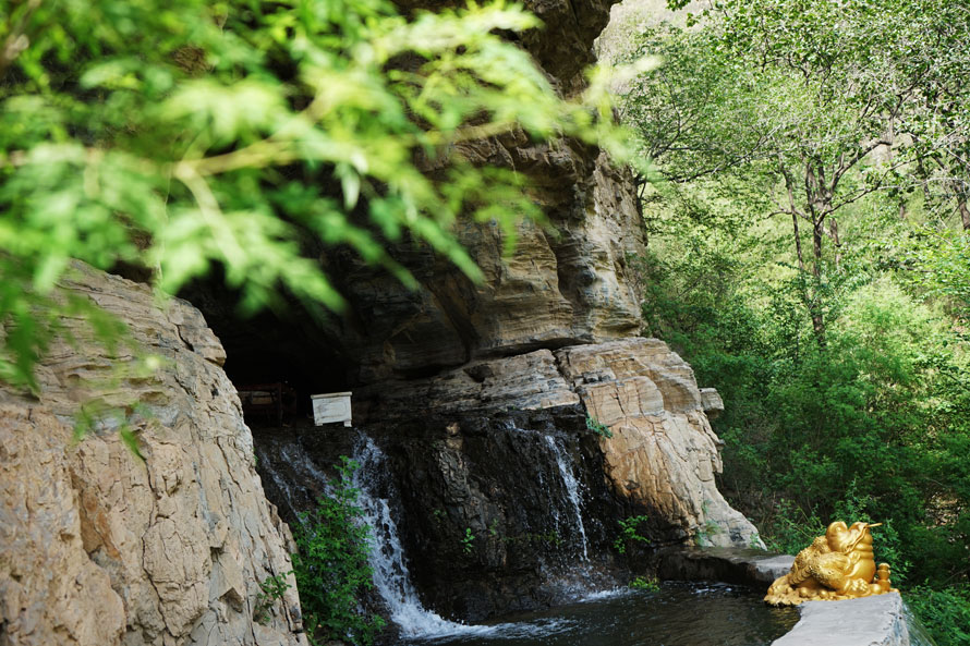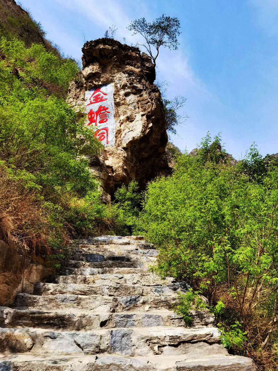偶尔,有“哗哗”的水流从脚下的小桥淌过,如果你抬头仰望,找寻水的来处,你会发现头顶那片山崖上的三个大字“金蟾洞”,没错,水就是从金蟾洞里潺潺流出,温润了山野,青翠了草木。