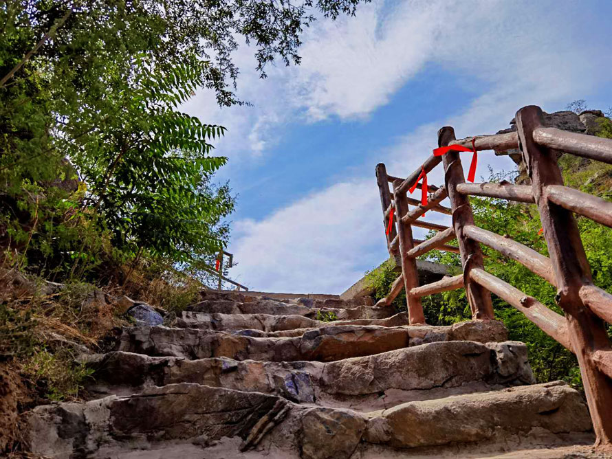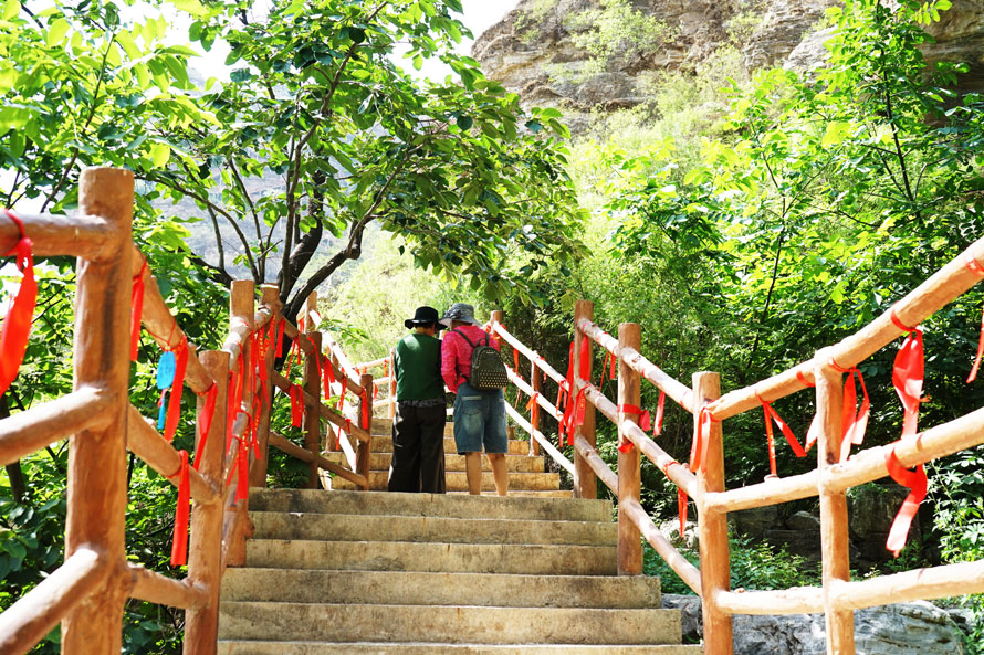 “祈福”线路的小径台阶借着山势而上,横跨朝天沟,在半山腰形成一个半圆,虽然环绕但是坡缓,走上去并不费力,沿途的护栏上有游客系挂的红色绳结和祈福小牌,鲜艳的色彩在绿意央然中成为别致风景。