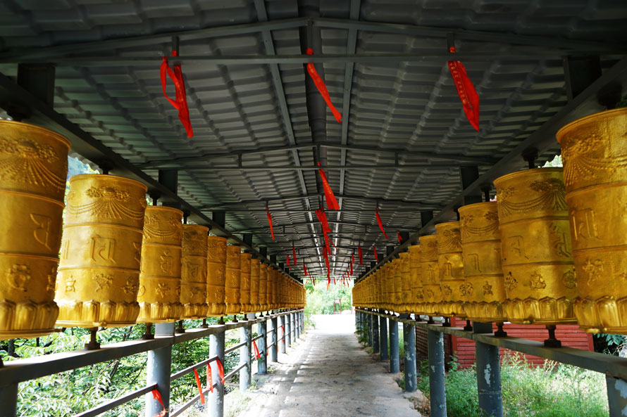 转经走廊由两排金色转经筒组成,供游客经过时,转动经筒。出了转经走廊就能看到三尊大佛——前世佛燃灯佛、现在佛释迦牟尼佛和未来佛弥勒佛,他们眉目低垂,静默尘世,俯瞰每一位途径于此的匆匆过客。