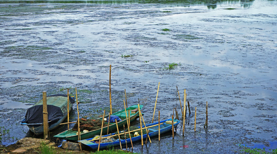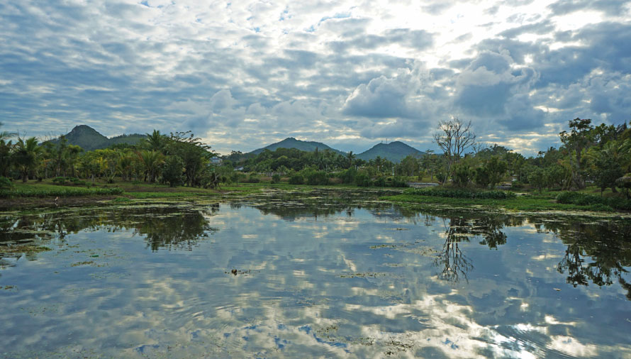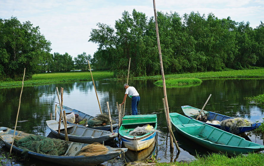 村子的外围一侧有一条滨海长廊,这是与内海的分界线,堤岸上各种鲜花与椰树在风中摇曳作响,一眼望去生态湿地尽收眼底,湖泊边有一位大爷在船上忙活,我过去搭讪,但是却相互不懂。