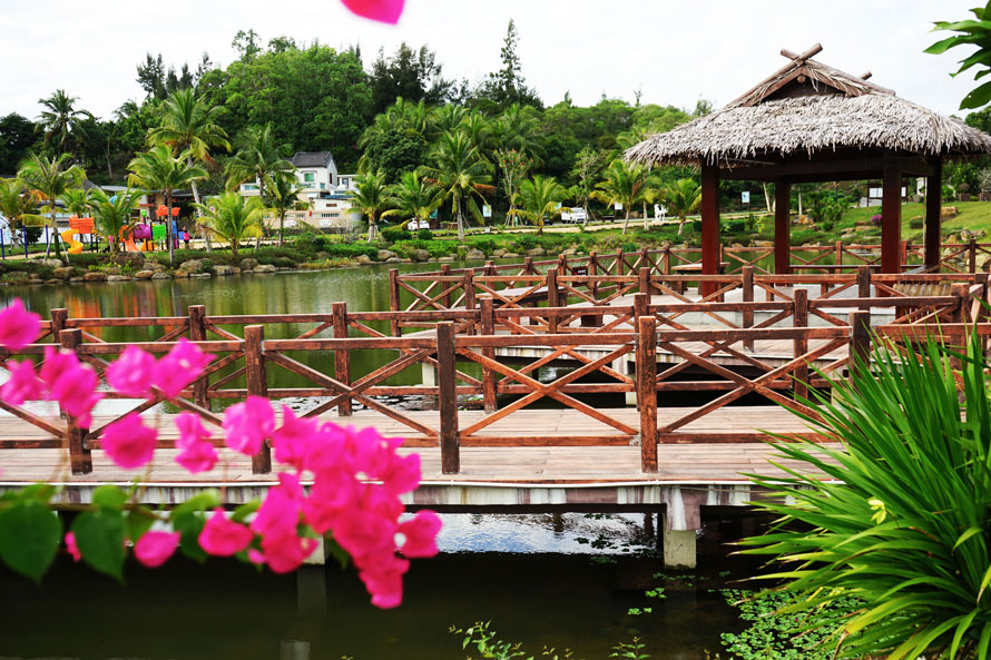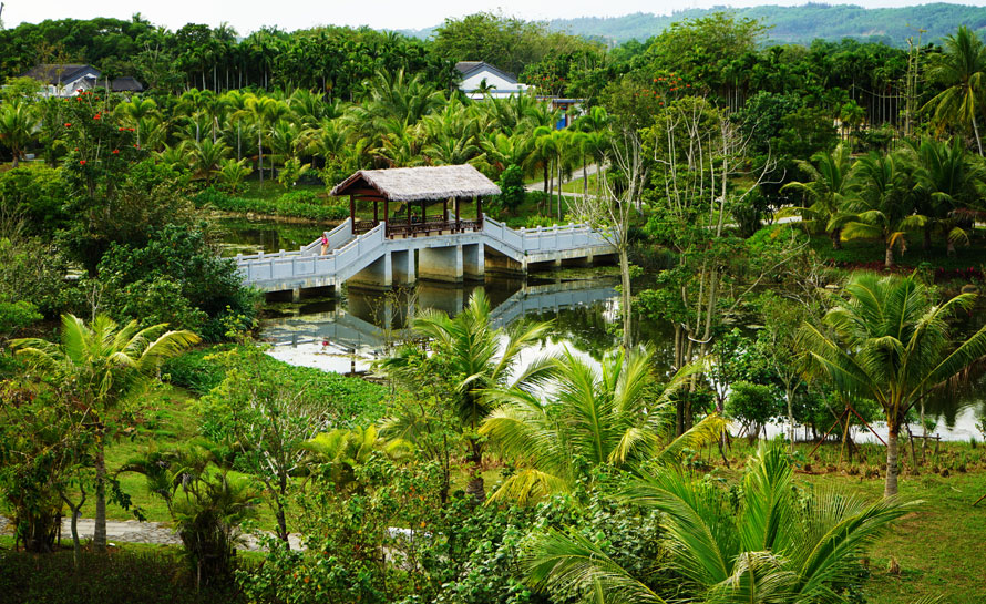 村子东头是一片植物园似的区域,溪流纵横,各种亚热带植物将这片大地描绘出一幅花园般的美景,登上四层的观景台,举目瞭望,民居、椰林、溪水、石桥以及远山,在视线里绘就绝美图景。